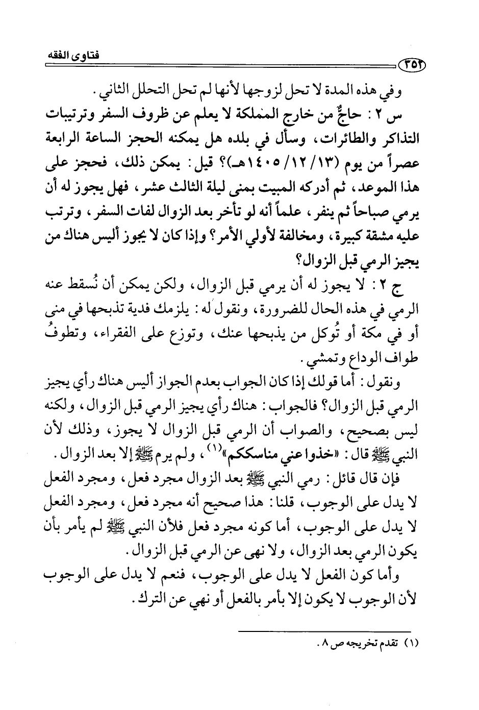 ونقول: أما قولك إذا كان الجواب بعدم الجواز أليس هناك رأي يجيز الرمي قبل الزوال؟ فالجواب: هناك رأي يجيز الرمي قبل الزوال، ولكنه ليس بصحيح، والصواب أن الرمي قبل الزوال لا يجوز، وذلك لأن النبي - صلى الله عليه وسلم - قال: "خذوا عني مناسككم " (1) ، ولم يرم - صلى الله عليه وسلم - إلا بعد الزوال.