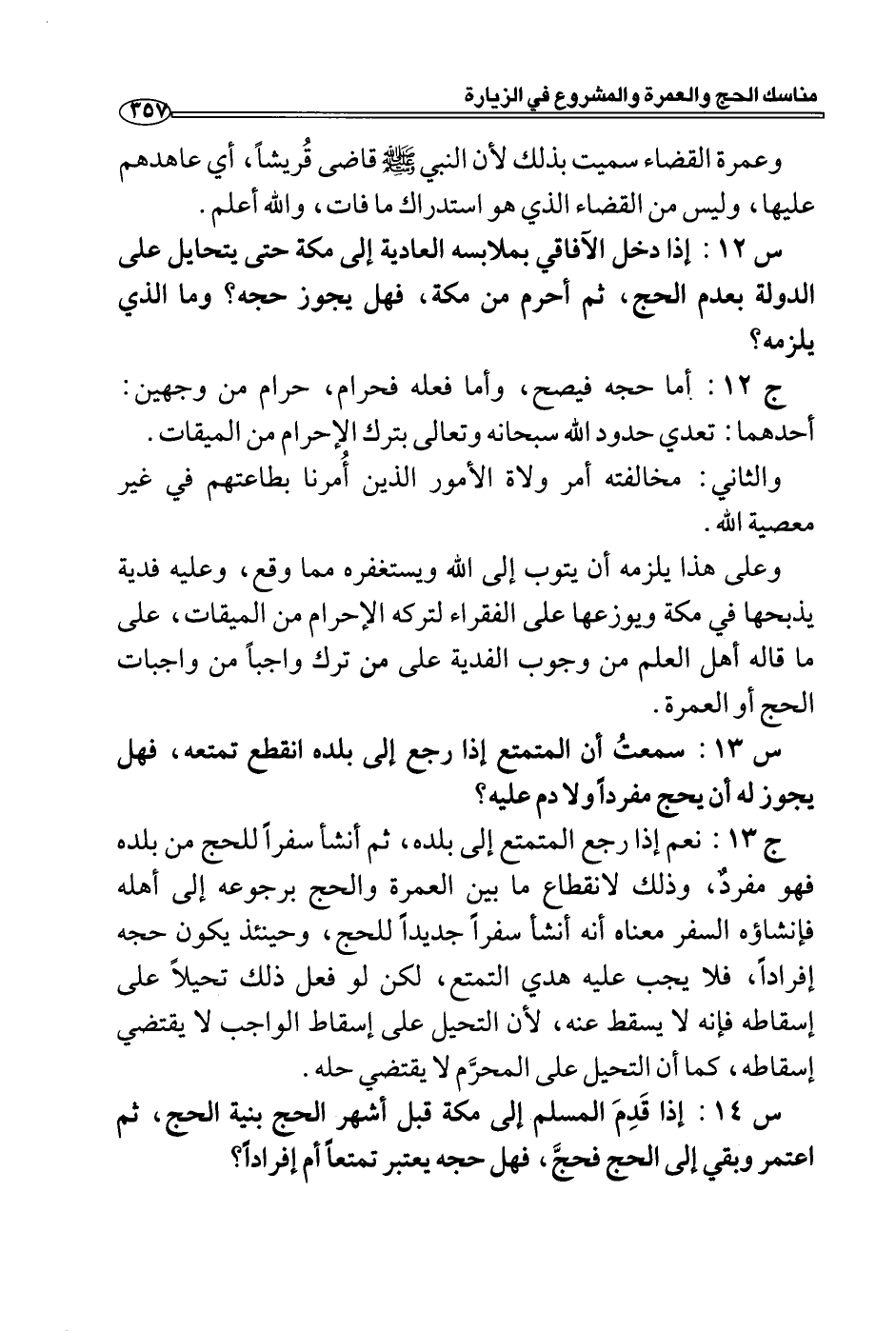 ج 13: نعم إذا رجع المتمتع إلى بلده، ثم أنشأ سفراً للحج من بلده فهو مفردٌ، وذلك لانقطاع ما بين العمرة والحج برجوعه إلى أهله فإنشاؤه السفر معناه أنه أنشأ سفراً جديداً للحج، وحينئذ يكون حجه إفراداً، فلا يجب عليه هدي التمتع، لكن لو فعل ذلك تحيلاً على إسقاطه فإنه لا يسقط عنه، لأن التحيل على إسقاط الواجب لا يقتضي إسقاطه، كما أن التحيل على المحرَّم لا يقتضي حله.