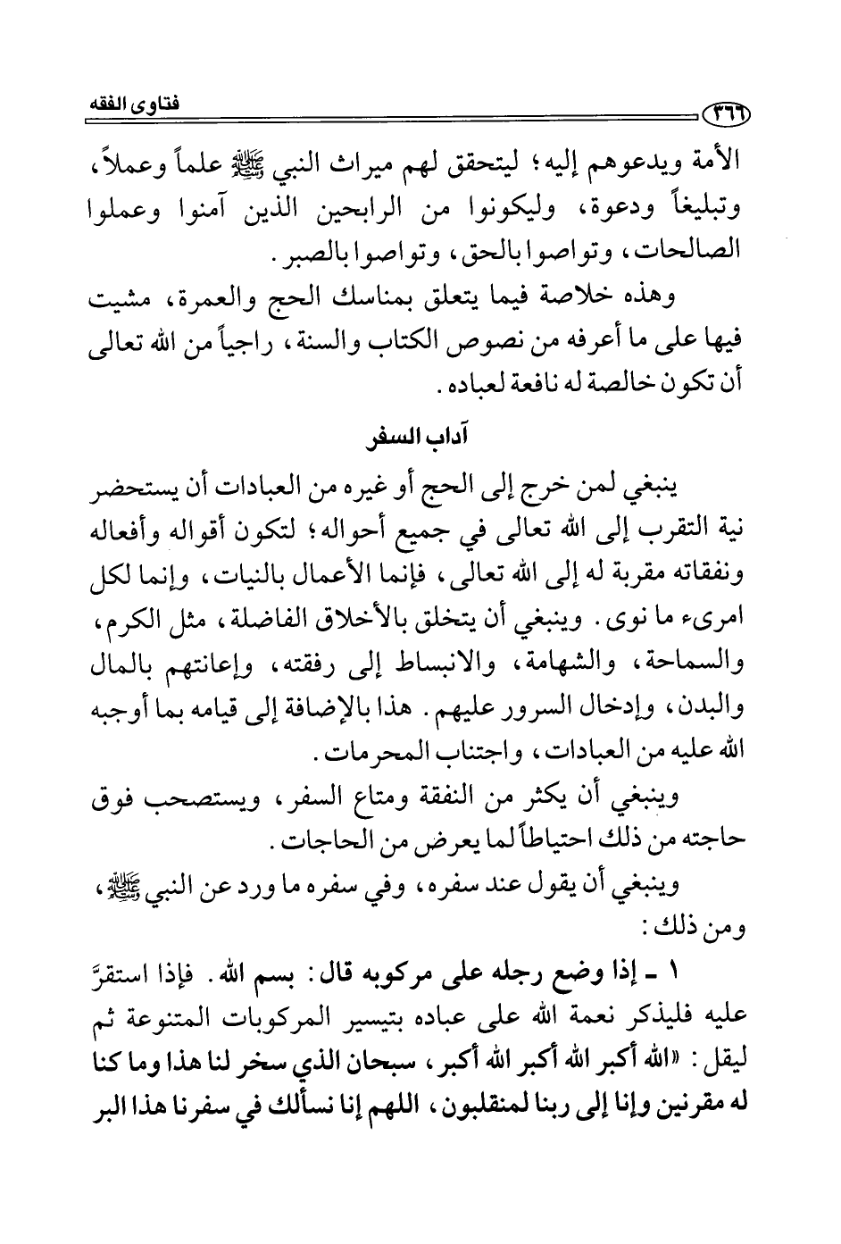 1- إذا وضع رجله على مركوبه قال: بسم الله. فإذا استقرَّ عليه فليذكر نعمة الله على عباده بتيسير المركوبات المتنوعة ثم ليقل: "الله أكبر الله اكبر الله أكبر، سبحان الذي سخر لنا هذا وما كنا