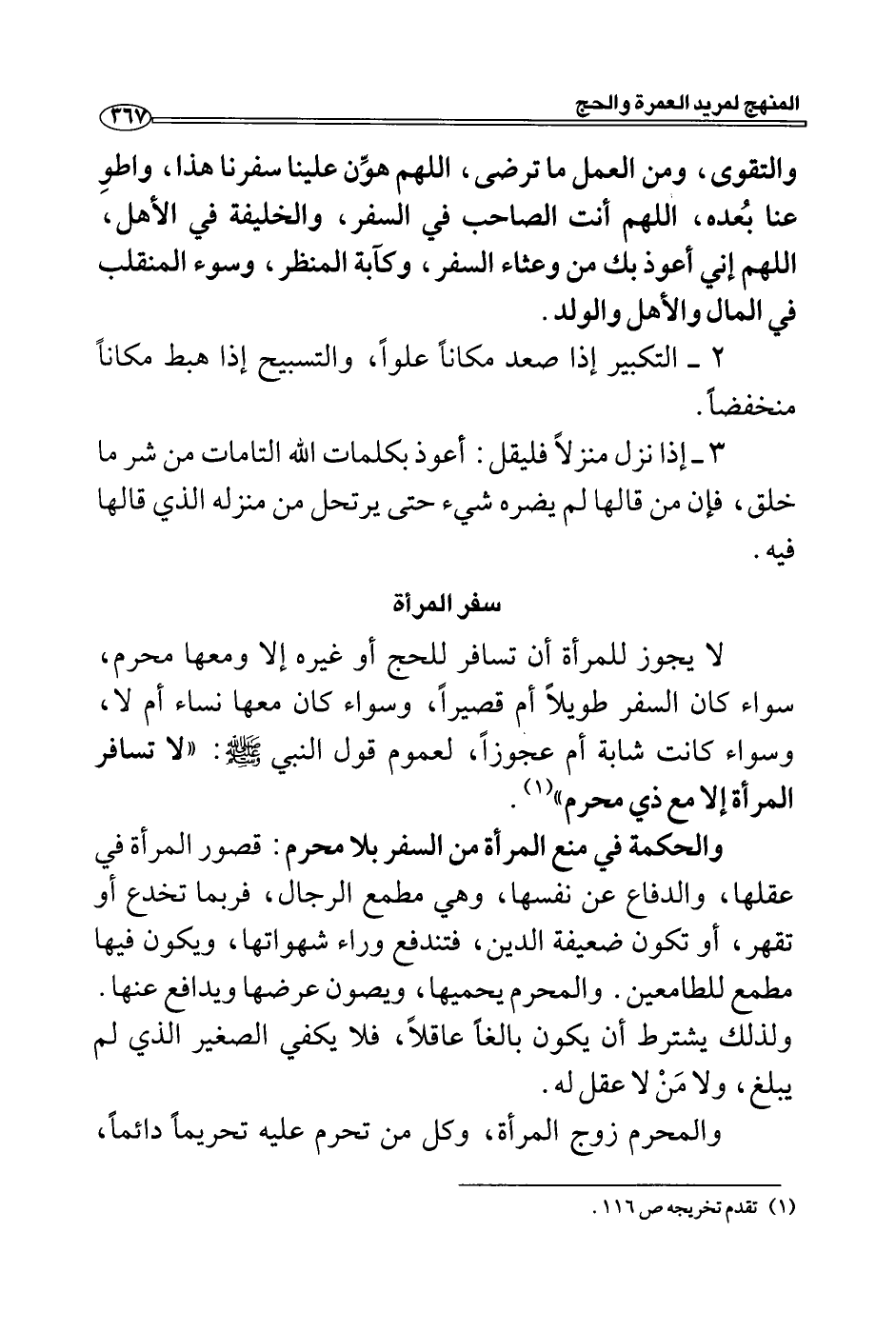والحكمة في منع المرأة من السفر بلا محرم: قصور المرأة في عقلها، والدفاع عن نفسها، وهي مطمع الرجال، فربما تخدع أو تقهر، أو تكون ضعيفة الدين، فتندفع وراء شهواتها، ويكون فيها مطمع للطامعين. والمحرم يحميها، ويصون عرضها ويدافع عنها. ولذلك يشترط أن يكون بالغاً عاقلاً، فلا يكفي الصغير الذي لم يبلغ، ولا مَنْ لا عقل له.