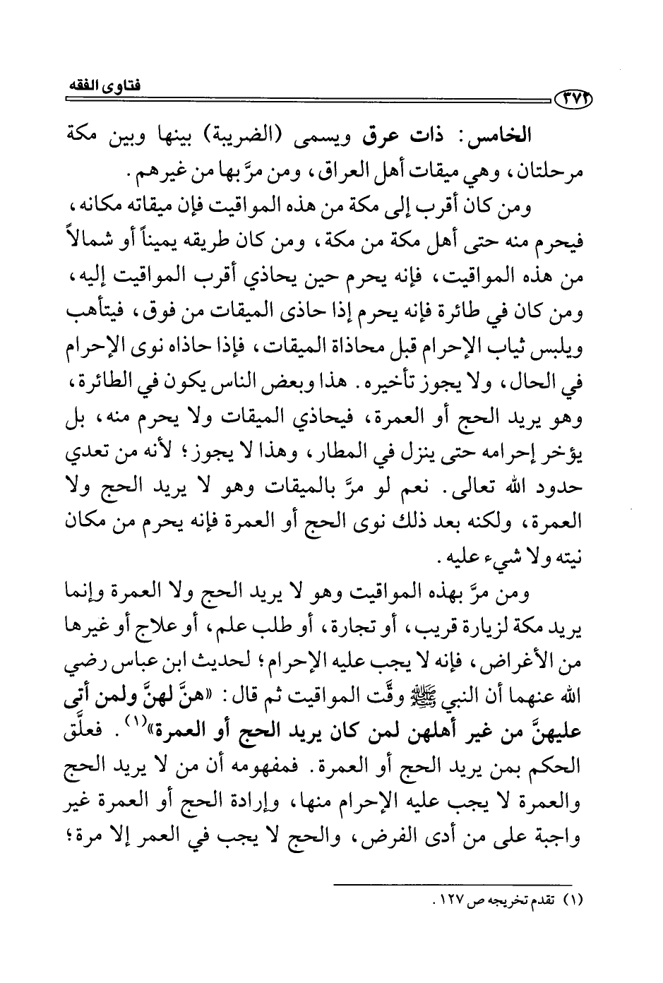 الخامس: ذات عرق ويسمى (الضريبة) بينها وبين مكة مرحلتان، وهي ميقات أهل العراق، ومن مرَّ بها من غيرهم.