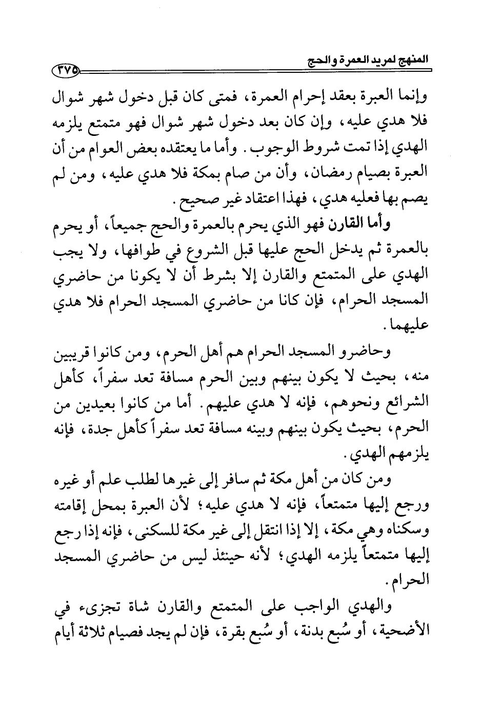 وإنما العبرة بعقد إحرام العمرة، فمتى كان قبل دخول شهر شوال فلا هدي عليه، وإن كان بعد دخول شهر شوال فهو متمتع يلزمه الهدي إذا تمت شروط الوجوب. وأما ما يعتقده بعض العوام من أن العبرة بصيام رمضان، وأن من صام بمكة فلا هدي عليه، ومن لم يصم بها فعليه هدي، فهذا اعتقاد غير صحيح. وأما القارن فهو الذي يحرم بالعمرة والحج جميعاً، أو يحرم بالعمرة ثم يدخل الحج عليها قبل الشروع في طوافها، ولا يجب الهدي على المتمتع والقارن إلا بشرط أن لا يكونا من حاضري المسجد الحرام، فإن كانا من حاضري المسجد الحرام فلا هدي عليهما.