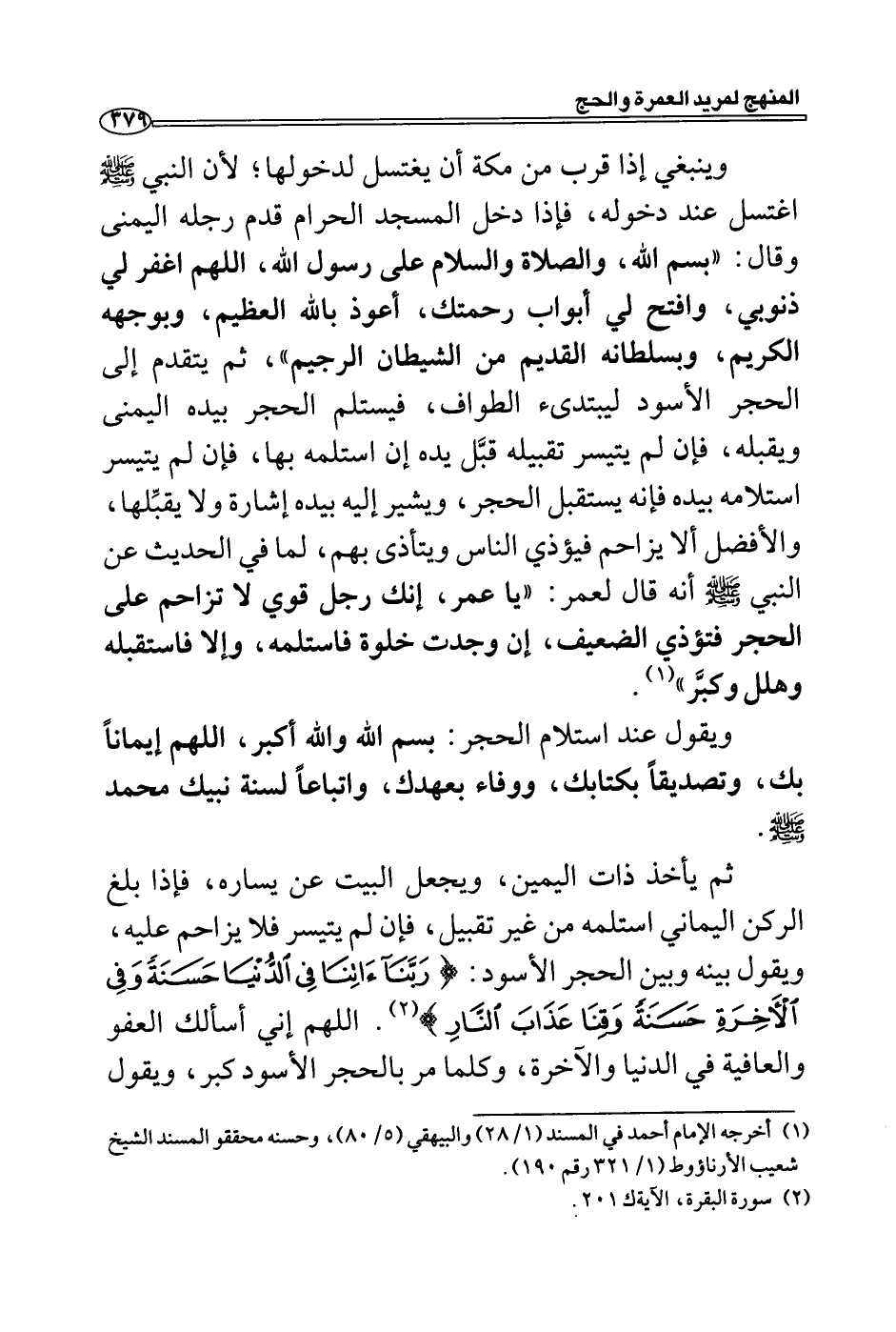 وينبغي إذا قرب من مكة أن يغتسل لدخولها؛ لأن النبي - صلى الله عليه وسلم - اغتسل عند دخوله، فإذا دخل المسجد الحرام قدم رجله اليمنى وقال: "بسم الله، والصلاة والسلام على رسول الله، اللهم اغفر لي ذنوبي، وافتح لي أبواب رحمتك، أعوذ بالله العظيم، وبوجهه الكريم، وبسلطانه القديم من الشيطان الرجيم "، ثم يتقدم إلى الحجر الأسود ليبتدىء الطواف، فيستلم الحجر بيده اليمنى ويقبله، فإن لم يتيسر تقبيله قبَّل يده إن استلمه بها، فإن لم يتيسر استلامه بيده فإنه يستقبل الحجر، ويشير إليه بيده إشارة ولا يقبِّلها، والأفضل ألا يزاحم فيؤذي الناس ويتأذى بهم، لما في الحديث عن النبي - صلى الله عليه وسلم - أنه قال لعمر: "يا عمر، إنك رجل قوي لا تزاحم على
