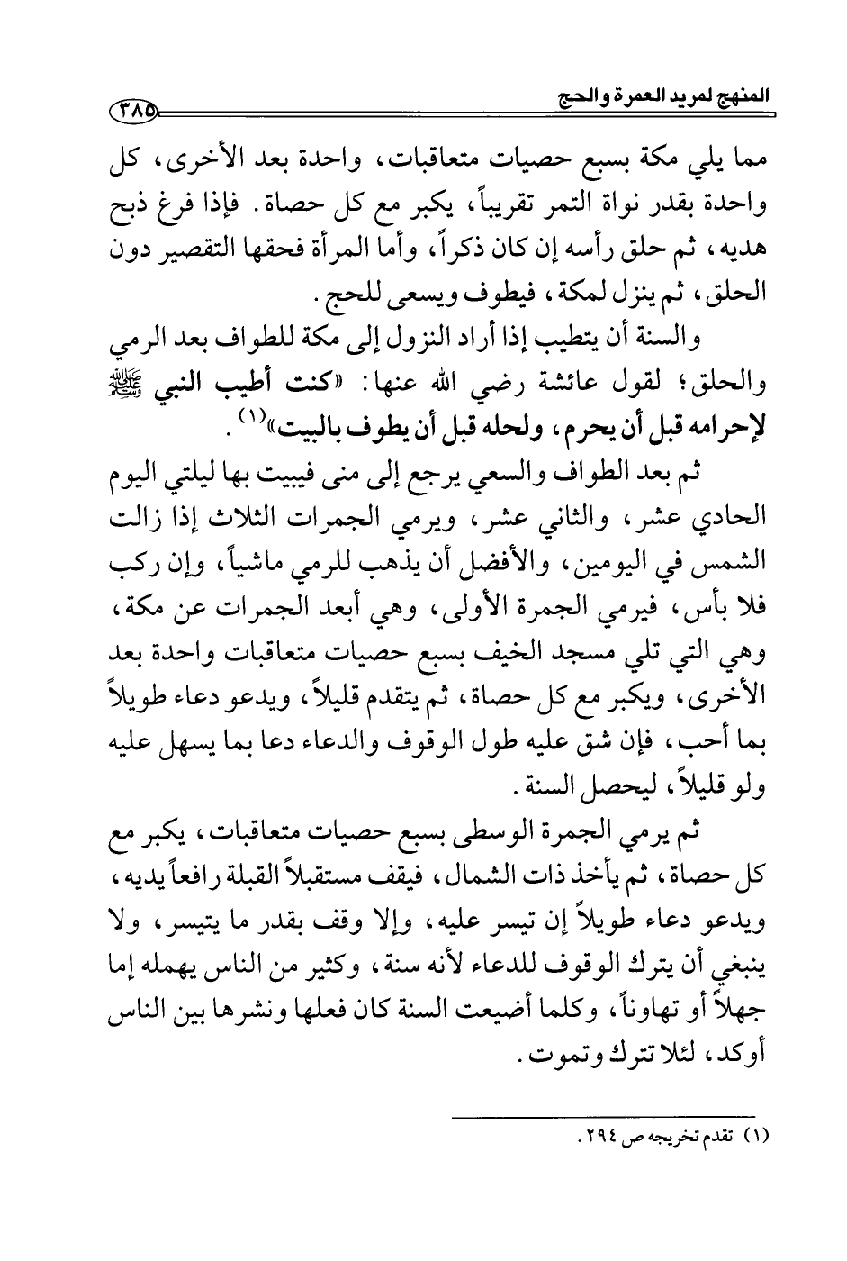 مما يلي مكة بسبع حصيات متعاقبات، واحدة بعد الأخرى، كل واحدة بقدر نواة التمر تقريباً، يكبر مع كل حصاة. فإذا فرغ ذبح هديه، ثم حلق رأسه إن كان ذكراً، وأما المرأة فحقها التقصير دون