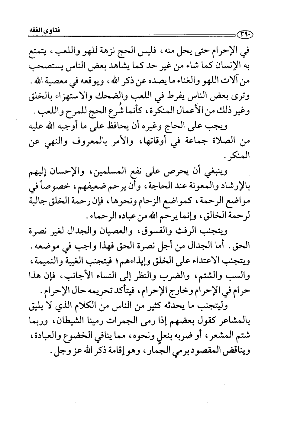 في الإحرام حتى يحل منه، فليس الحج نزهة للهو واللعب، يتمتع به الإنسان كما شاء من غير حد كما يشاهد بعض الناس يستصحب من آلات اللهو والغناء ما يصده عن ذكر الله، ويوقعه في معصية الله.