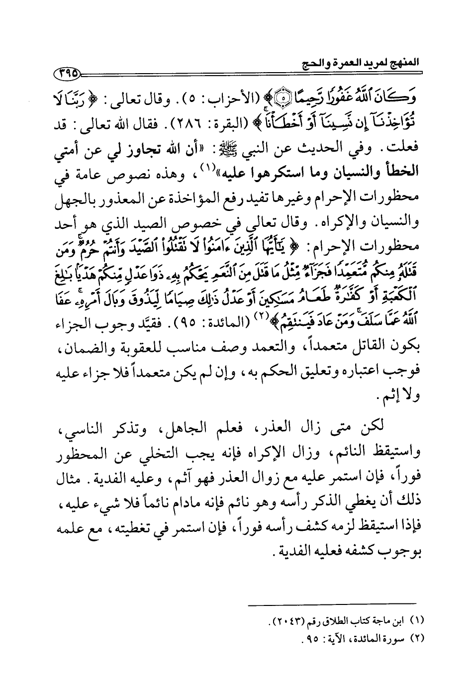 وَكَانَ اللَّهُ غَفُوراً رَحِيما) ً (5) (الأحزاب: هـ) . وقال تعالى: (رَبَّنَا لا تُؤَاخِذْنَا إِنْ نَسِينَا أَوْ أَخْطَأْنَا) (البقرة: 286) . فقال الله تعالى: قد فعلت. وفي الحديث عن النبي - صلى الله عليه وسلم -: "أن الله تجاوز لي عن أمتي الخطأ والنسيان وما استكرهوا عليه " (1) ، وهذه نصوص عامة في محظورات الإحرام وغيرها تفيد رفع المؤاخذة عن المعذور بالجهل والنسيان والإكراه. وقال تعالى في خصوص الصيد الذي هو أحد محظورات الإحرام: (مِثْلُ مَا قَتَلَ مِنَ النَّعَمِ يَحْكُمُ بِهِ ذَوَا عَدْلٍ مِنْكُمْ هَدْياً بَالِغَ الْكَعْبَةِ أَوْ كَفَّارَةٌ طَعَامُ مَسَاكِينَ أَوْ عَدْلُ ذَلِكَ صِيَاماً لِيَذُوقَ وَبَالَ أَمْرِهِ عَفَا اللَّهُ عَمَّا سَلَفَ وَمَنْ عَادَ فَيَنْتَقِمُ) (2) (المائدة: 95) . فقيَّد وجوب الجزاء بكون القاتل متعمداً، والتعمد وصف مناسب للعقوبة والضمان، فوجب اعتباره وتعليق الحكم به، وإن لم يكن متعمداً فلا جزاء عليه ولا إثم.