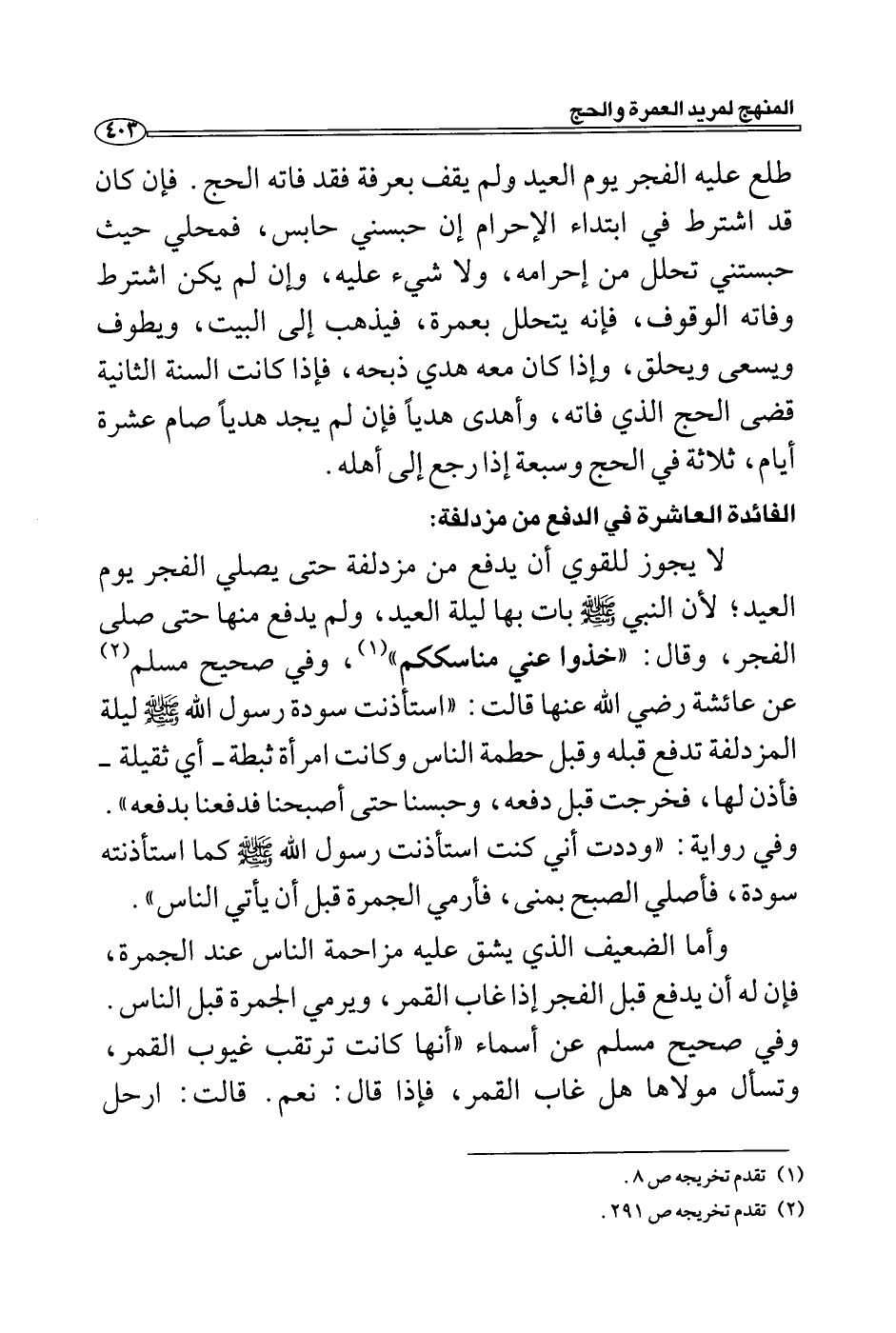 لا يجوز للقوي أن يدفع من مزدلفة حتى يصلي الفجر يوم العيد؛ لأن النبي - صلى الله عليه وسلم - بات بها ليلة العيد، ولم يدفع منها حتى صلى الفجر، وقال: "خذوا عني مناسككم " (1) ، وفي صحيح مسلم (2) عن عائشة رضي الله عنها قالت: "استأذنت سودة رسول الله ليلة المزدلفة تدفع قبله وقبل حطمة الناس وكانت امرأة ثبطة- أي ثقيلة- فأذن لها، فخرجت قبل دفعه، وحبسنا حتى أصبحنا فدفعنا بدفعه ".