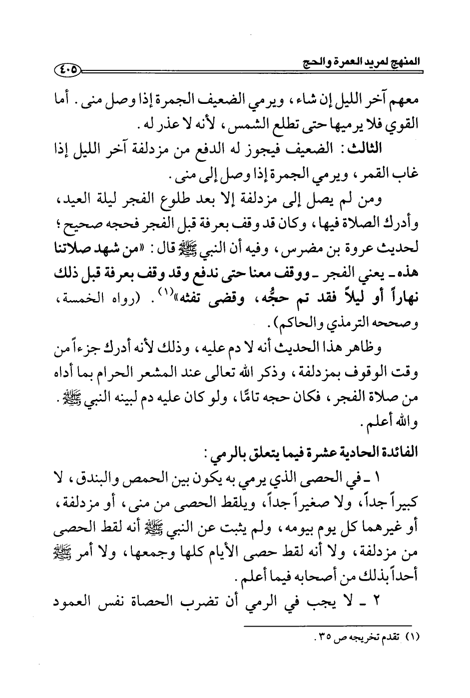 ومن لم يصل إلى مزدلفة إلا بعد طلوع الفجر ليلة العيد، وأدرك الصلاة فيها، وكان قد وقف بعرفة قبل الفجر فحجه صحيح؛ لحديث عروة بن مضرس، وفيه أن النبي - صلى الله عليه وسلم - قال: "من شهد صلاتنا هذه- يعني الفجر- ووقف معنا حتى ندفع وقد وقف بعرفة قبل ذلك نهاراً أو ليلاً فقد تم حجُّه، وقضى تفثه " (1) . (رواه الخمسة، وصححه الترمذي والحاكم) .