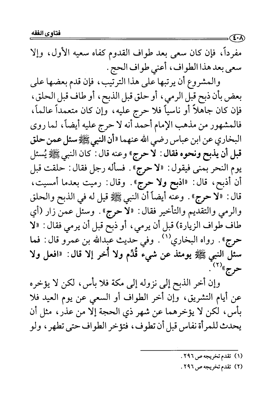 قال: "لا حرج ". وعنه أيضاً أن النبي - صلى الله عليه وسلم - قيل له في الذبح والحلق والرمي والتقديم والتأخير فقال: "لا حرج ". وسئل عمن زار (أي طاف طواف الزيارة) قبل أن يرمي، أو ذبح قبل أن يرمي فقال: "لا حرج ". رواه البخاري (1) . وفي حديث عبد الله بن عمرو قال: فما