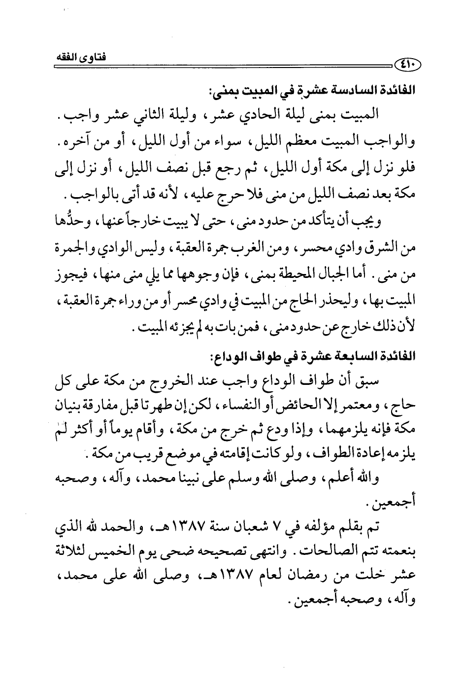ويجب أن يتأكد من حدود منى، حتى لا يبيت خارجاً عنها، وحدُّها من الشرق وادي محسر، ومن الغرب جمرة العقبة، وليس الوادي والجمرة من منى. أما الجبال المحيطة بمنى، فإن وجوهها مما يلي منى منها، فيجوز المبيت بها، وليحذر الحاج من المبيت في وادي محسر أو من وراء جمرة العقبة، لأن ذلك خارج عن حدود منى، فمن بات به لم يجزئه البيت. الفائدة السابعة عشرة في طواف الوداع: