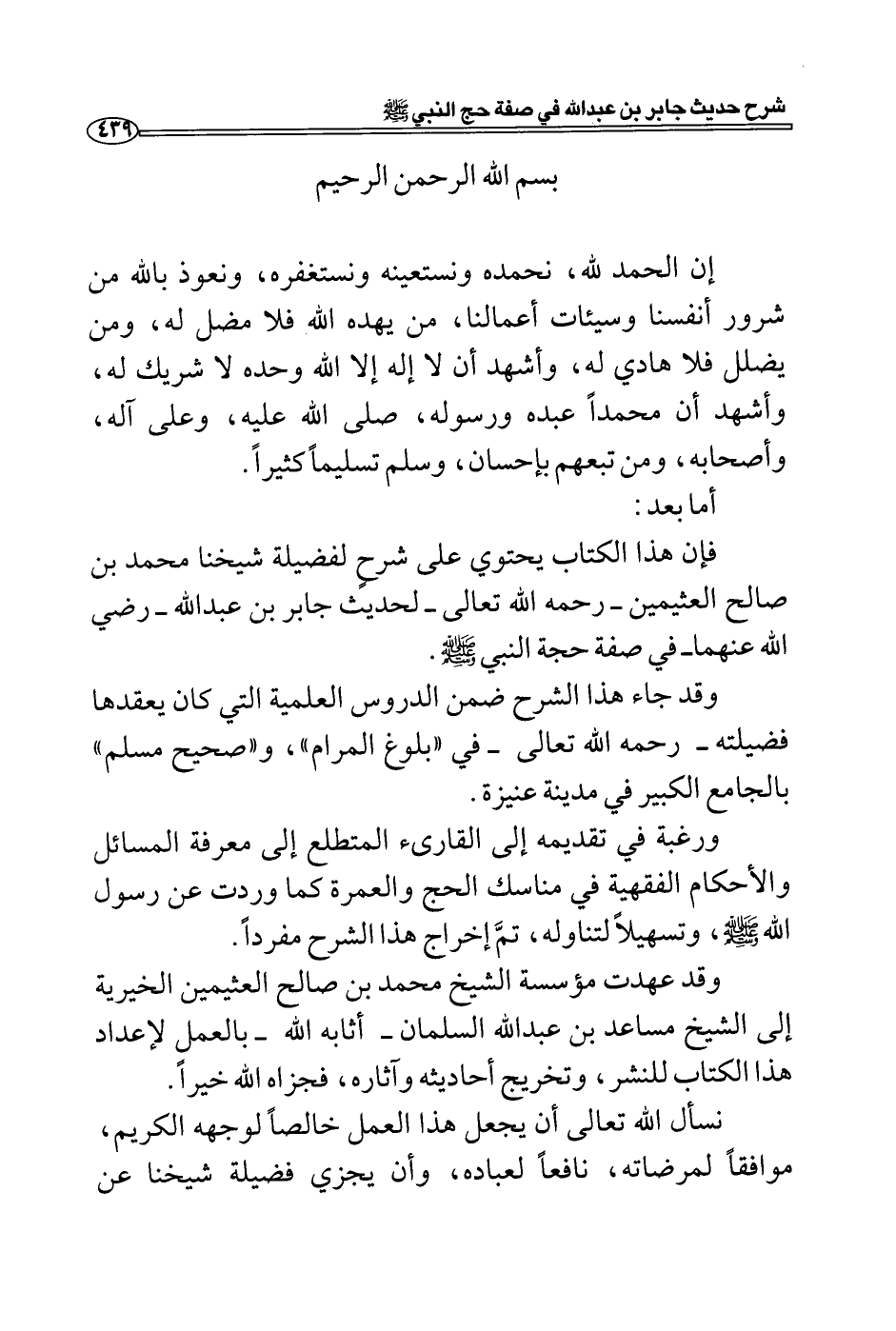 فإن هذا الكتاب يحتوي على شرع لفضيلة شيخنا محمد بن صالح العثيمين- رحمه الله تعالى- لحديث جابر بن عبد الله- رضي الله عنهما- في صفة حجة النبي - صلى الله عليه وسلم -.