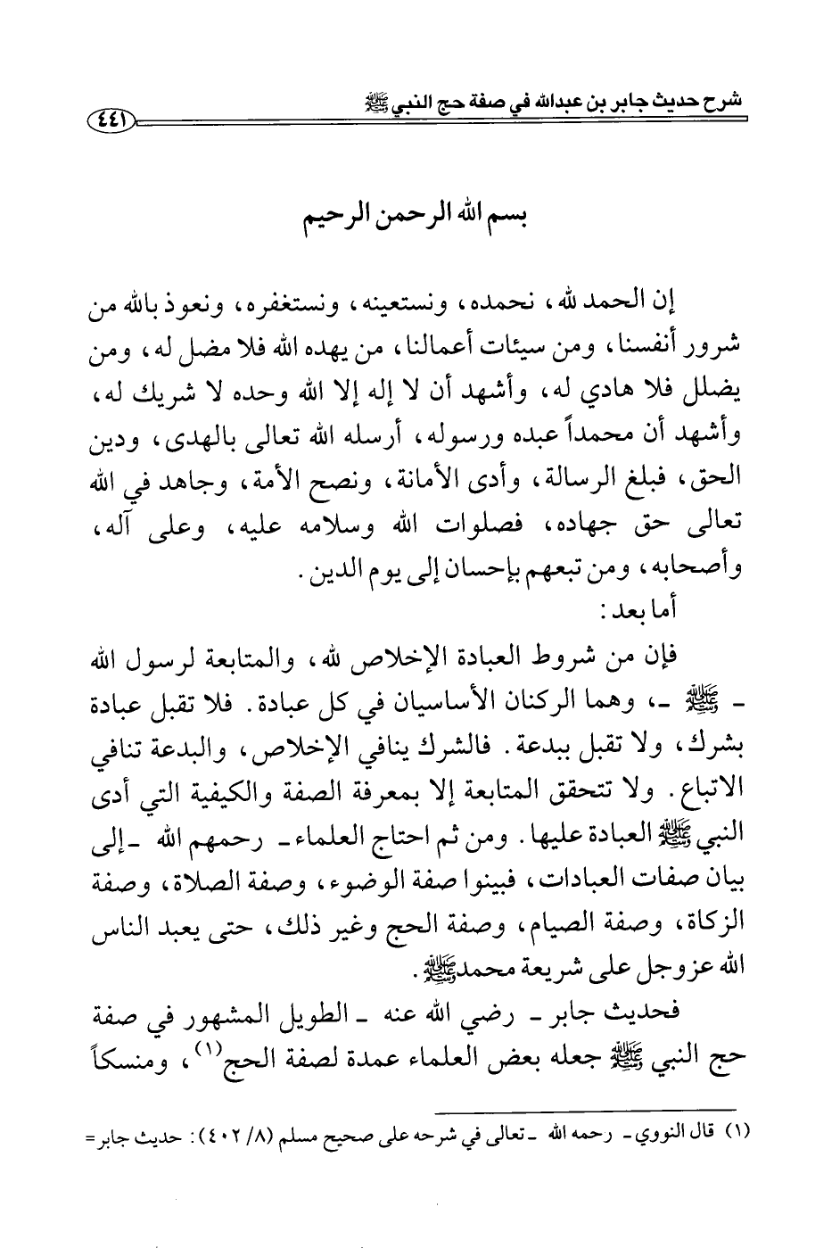 فحديث جابر- رضي الله عنه- الطويل المشهور في صفة حج النبي - صلى الله عليه وسلم - جعله بعض العلماء عمدة لصفة الحج (1) ، ومنسكاً