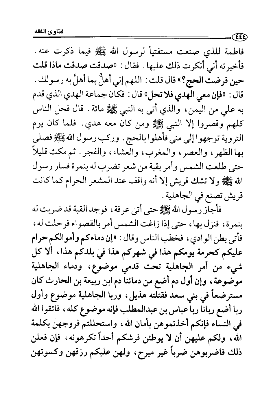 فاطمة للذي صنعت مستفتياً لرسول الله - صلى الله عليه وسلم - فيما ذكرت عنه. فأخبرته أني أنكرت ذلك عليها. فقال: "صدقت صدقت ماذا قلت حين فرضت الحج؟ " قال قلت: اللهم إني أهلُّ بما أهلَّ به رسولك.