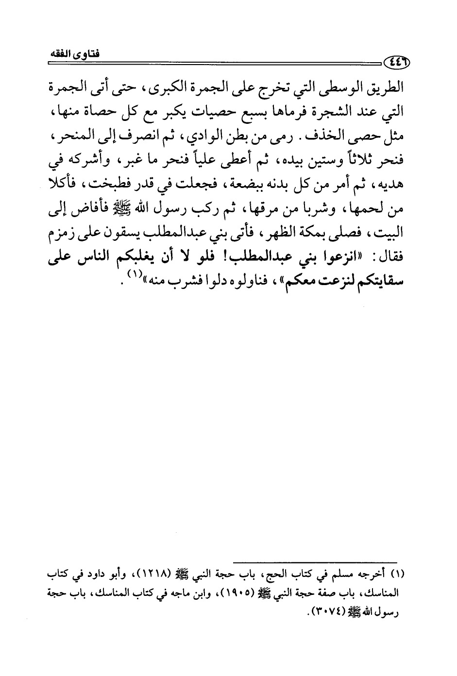 الطريق الوسطى التي تخرج على الجمرة الكبرى، حتى أتى الجمرة التي عند الشجرة فرماها بسبع حصيات يكبر مع كل حصاة منها، مثل حصى الخذف. رمى من بطن الوادي، ثم انصرف إلى المنحر، فنحر ثلاثاً وستين بيده، ثم أعطى علياً فنحر ما غبر، وأشركه في هديه، ثم أمر من كل بدنه ببضعة، فجعلت في قدر فطبخت، فأكلا من لحمها، وشربا من مرقها، ثم ركب رسول الله - صلى الله عليه وسلم - فأفاض إلى البيت، فصلى بمكة الظهر، فأتي بني عبد المطلب يسقون على زمزم