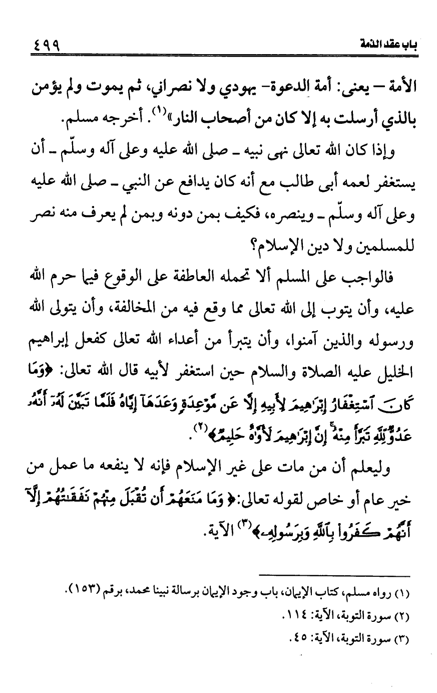 وإذا كان الله تعالى نهى نبيه- صلى الله عليه وعلى آله وسلّم- أن يستغفر لعمه أبى طالب مع أنه كان يدافع عن النبي- صلى الله عليه وعلى آله وسلّم- وينصره، فكيف بمن دونه وبمن لم يعرف منه نصر للمسلمين ولا دين الإسلام؟