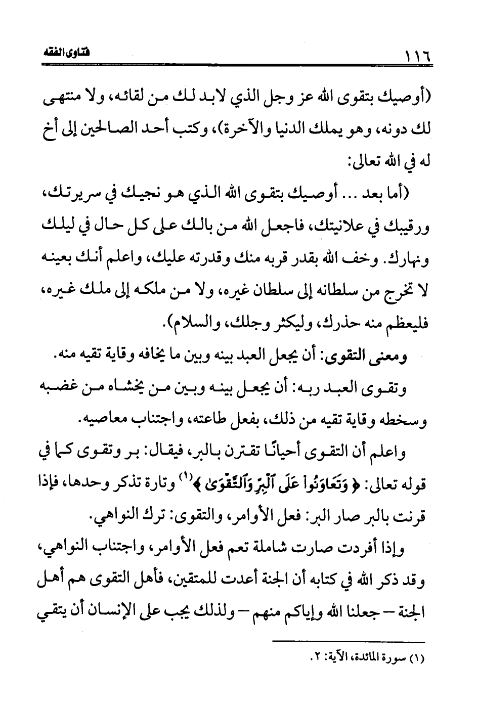 واعلم أن التقوى أحيانًا تقترن بالبر، فيقال: بر وتقوى كما في قوله تعالى: (وَتَعَاوَنُوا عَلَى الْبِرِّ وَالتَّقْوَى) (1) وتارة تذكر وحدها، فإذا قرنت بالبر صار البر: فعل الأوامر، والتقوى: ترك النواهي.