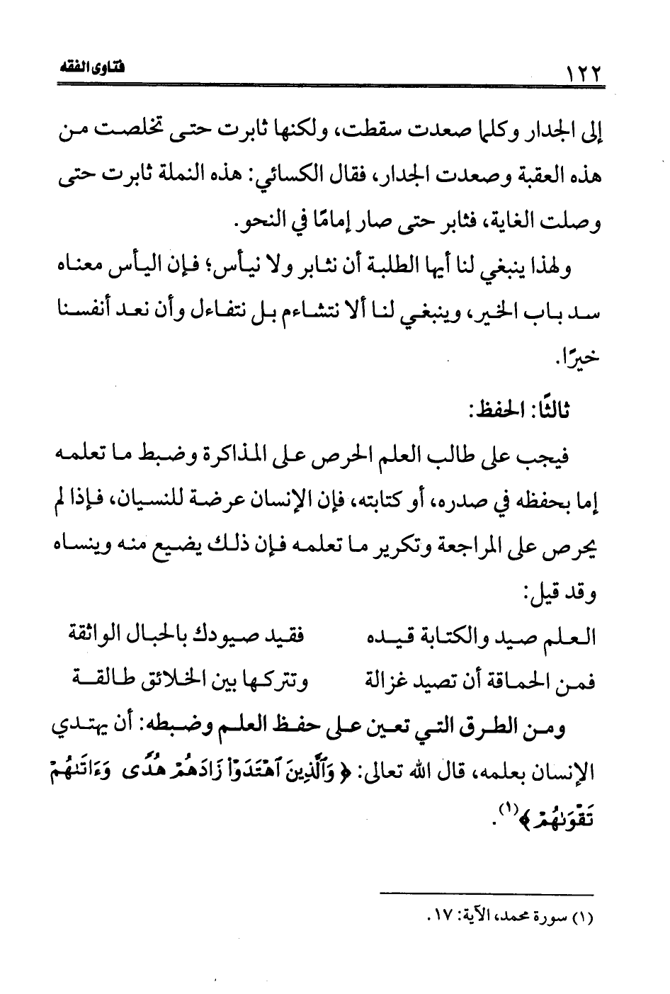 العلم صيد والكتابة قيده فقيد صيودك بالحبال الواثقة فمن الحماقة أن تصيد غزالة وتتركها بين الخلائق طالقة ومن الطرق التي تعين على حفظ العلم وضبطه: أن يهتدي الإنسان بعلمه، قال الله تعالى: (وَالَّذِينَ اهْتَدَوْا زَادَهُمْ هُدًى وَآَتَاهُمْ تَقْوَاهُمْ) (1) .