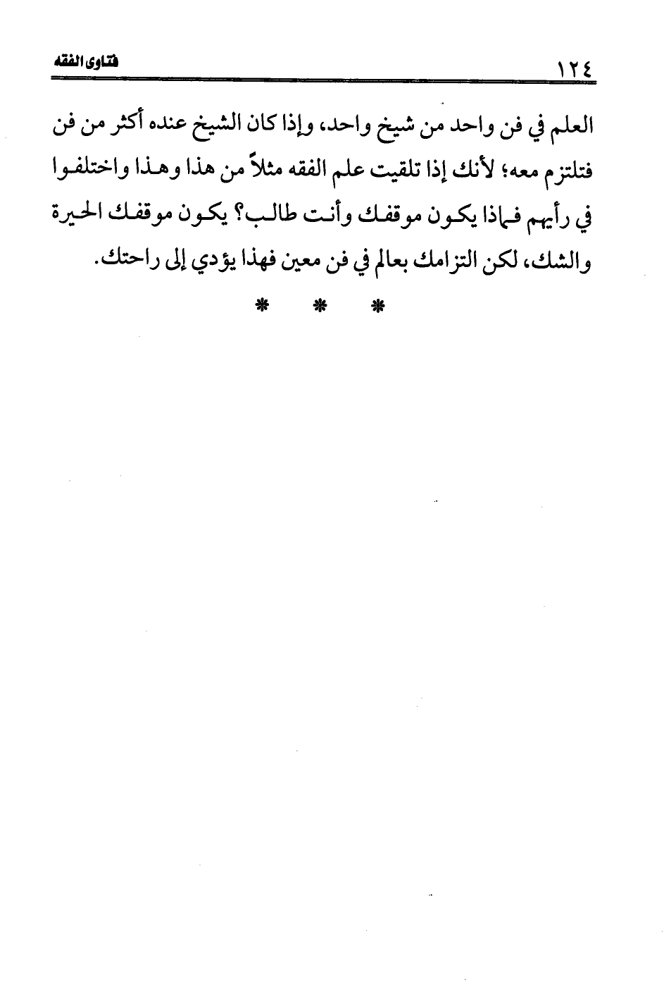 العلم في فن واحد من شيخ واحد، وإذا كان الشيخ عنده أكثر من فن فتلتزم معه؛ لأنك إذا تلقيت علم الفقه مثلاً من هذا وهذا واختلفوا في رأيهم فماذا يكون موقفك وأنت طالب؟ يكون موقفك الحيرة والشك، لكن التزامك بعالم في فن معين فهذا يؤدي إلى راحتك.