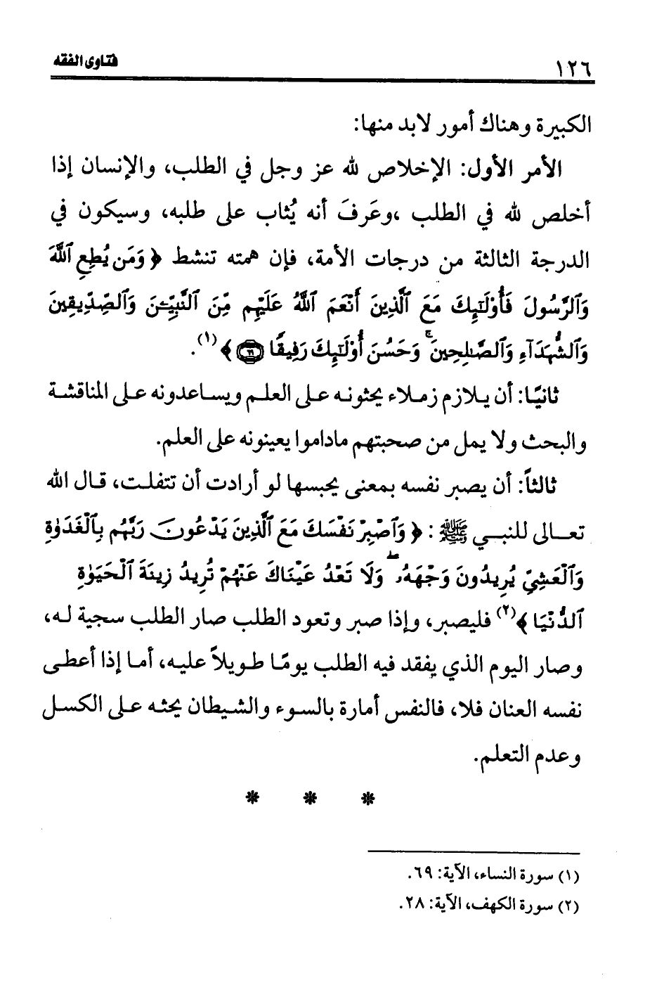 الأمر الأول: الإخلاص لله عز وجل في الطلب، والإنسان إذا أخلص لله في الطلب، وعَرفَ أنه يُثاب على طلبه، وسيكون في الدرجة الثالثة من درجات الأمة، فإن همته تنشط (وَمَنْ يُطِعِ اللَّهَ وَالرَّسُولَ فَأُولَئِكَ مَعَ الَّذِينَ أَنْعَمَ اللَّهُ عَلَيْهِمْ مِنَ النَّبِيِّينَ وَالصِّدِّيقِينَ وَالشُّهَدَاءِ وَالصَّالِحِينَ وَحَسُنَ أُولَئِكَ رَفِيقًا (69)) (1) .