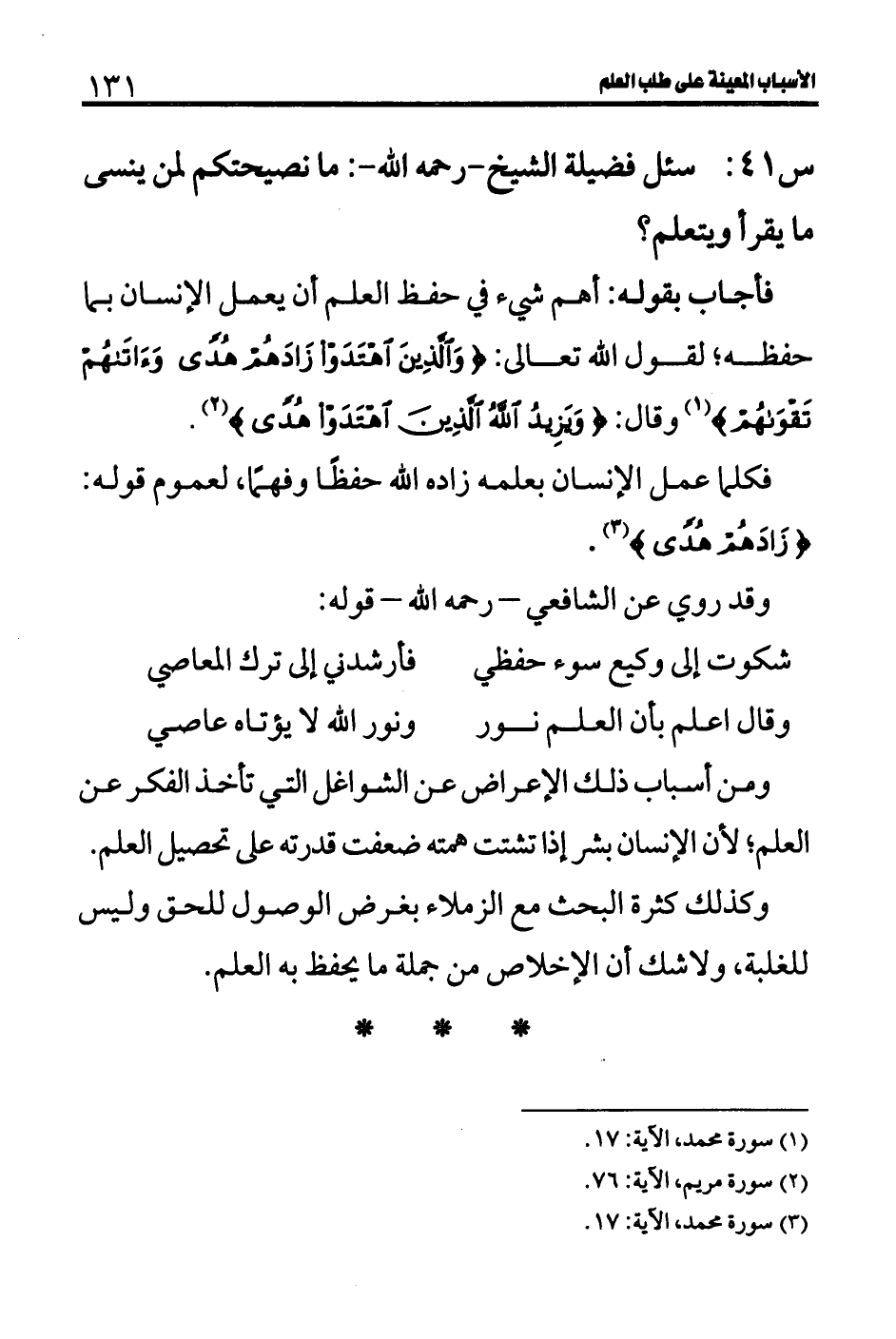 س 41: سئل فضيلة الشيخ- رحمه الله-: ما نصيحتكم لمن ينسى ما يقرأ ويتعلم؟