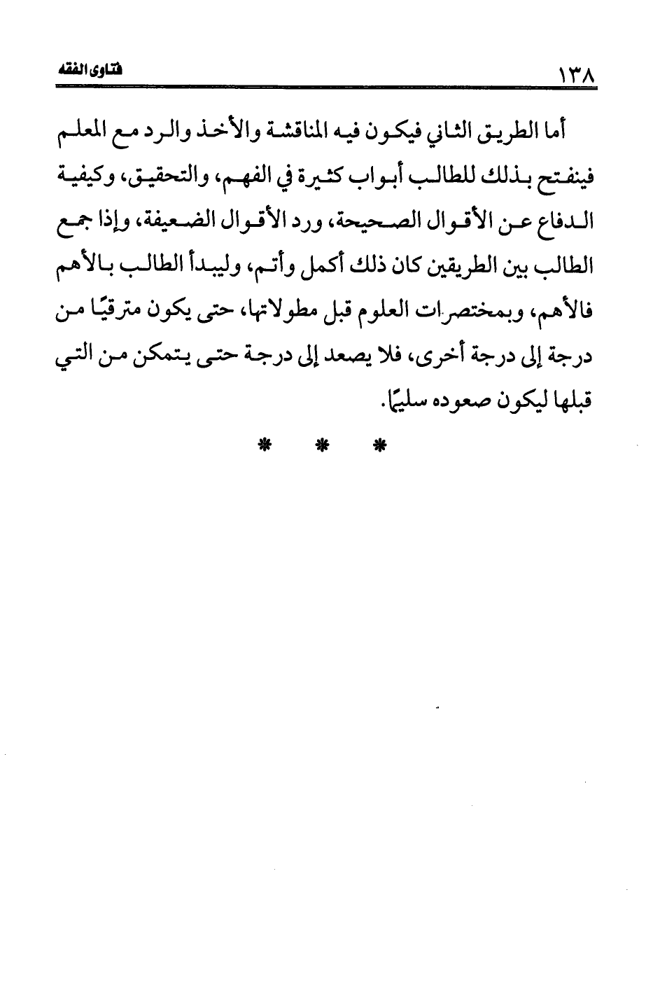 الطالب بين الطريقين كان ذلك أكمل وأتم، وليبدأ الطالب بالأهم فالأهم، وبمختصرات العلوم قبل مطولاتها، حتى يكون مترقيًا من درجة إلى درجة أخرى، فلا يصعد إلى درجة حتى يتمكن من التي