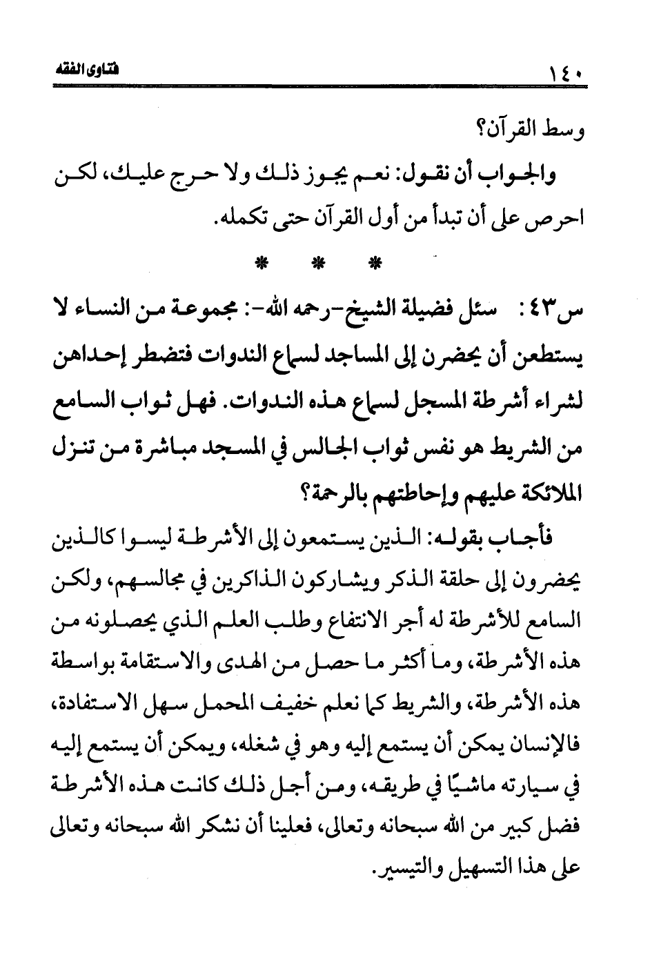 س 43: سئل فضيلة الشيخ- رحمه الله-: مجموعة من النساء لا يستطعن أن يحضرن إلى المساجد لسماع الندوات فتضطر إحداهن لشراء أشرطة المسجل لسماع هذه الندوات. فهل ثواب السامع