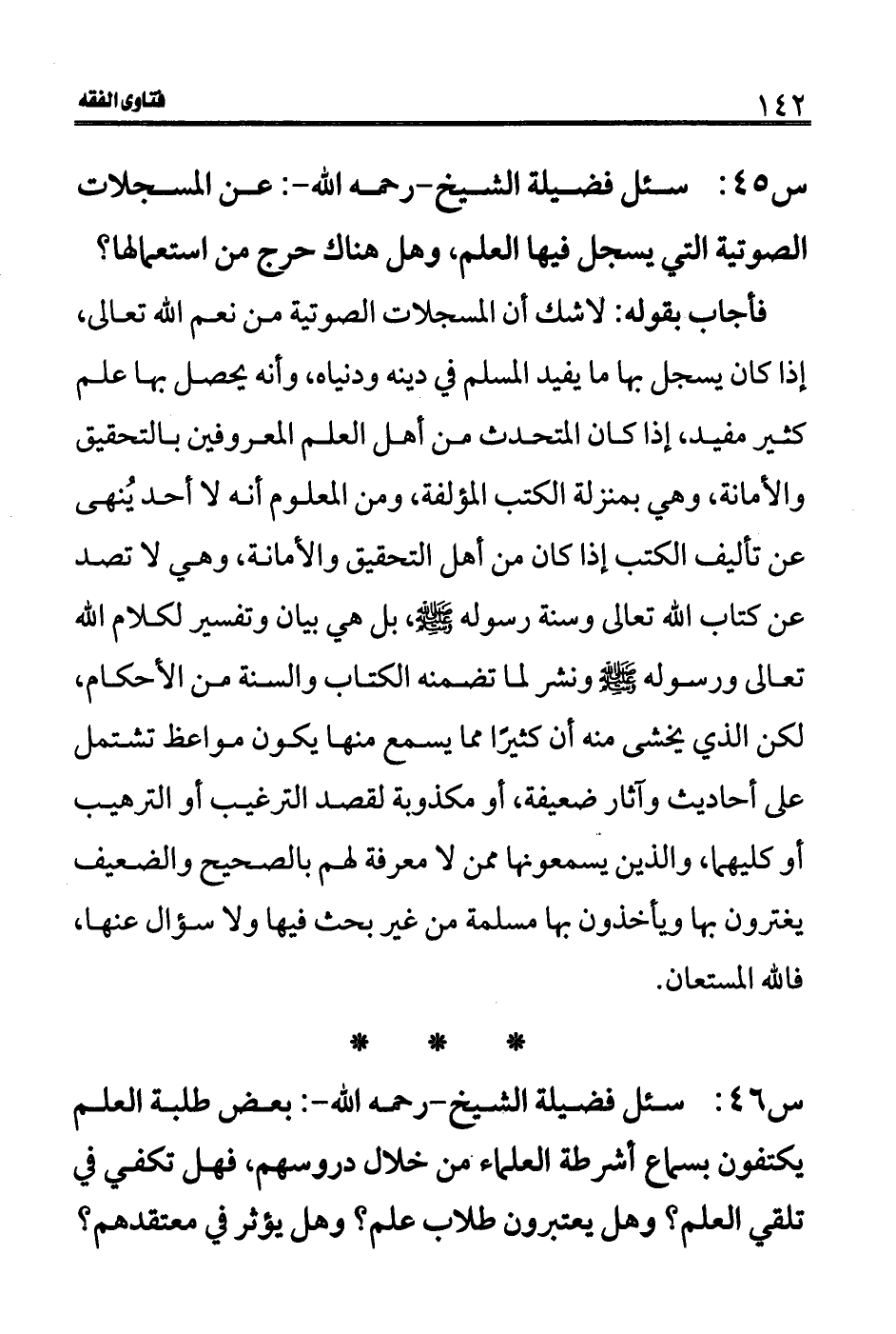 س 45: سئل فضيلة الشيخ- رحمه الله-: عن المسجلات الصوتية التي يسجل فيها العلم، وهل هناك حرج من استعمالها؟