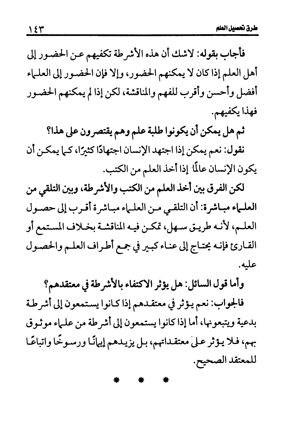 لكن الفرق بين أخذ العلم من الكتب والأشرطة، وبين التلقي من العلماء مباشرة: أن التلقي من العلماء مباشرة أقرب إلى حصول العلم، لأنه طريق سهل، تمكن فيه المناقشة بخلاف المستمع أو