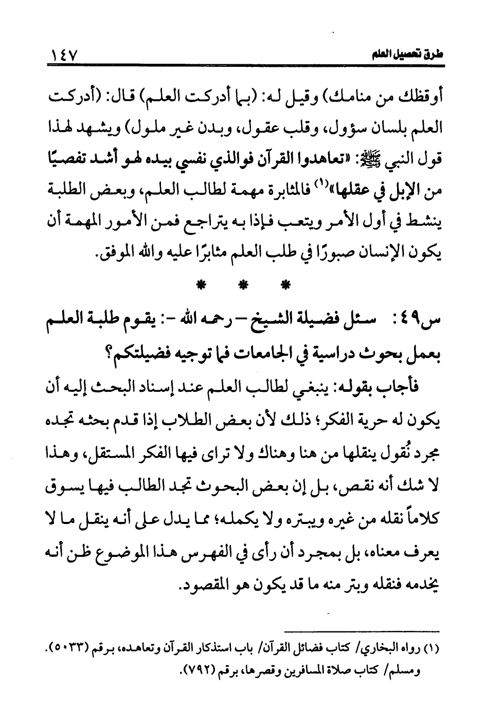 أوقظك من منامك) وقيل له: (بما أدركت العلم) قال: (أدركت العلم بلسان سؤول، وقلب عقول، وبدن غير ملول) ويشهد لهذا قول النبي - صلى الله عليه وسلم -: "تعاهدوا القرآن فوالذي نفسي بيده لهو أشد تفصيًا من الإبل في عقلها" (1) فالمثابرة مهمة لطالب العلم، وبعض الطلبة