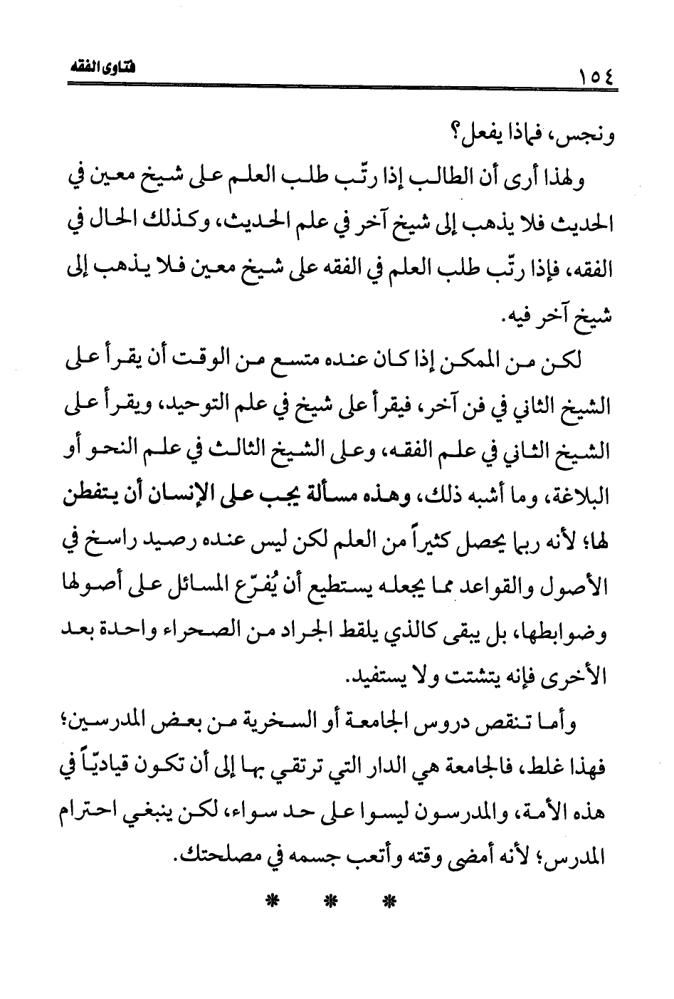 ولهذا أرى أن الطالب إذا رتّب طلب العلم على شيخ معين في الحديث فلا يذهب إلى شيخ آخر في علم الحديث، وكذلك الحال في الفقه، فإذا رتّب طلب العلم في الفقه على شيخ معين فلا يذهب إلى