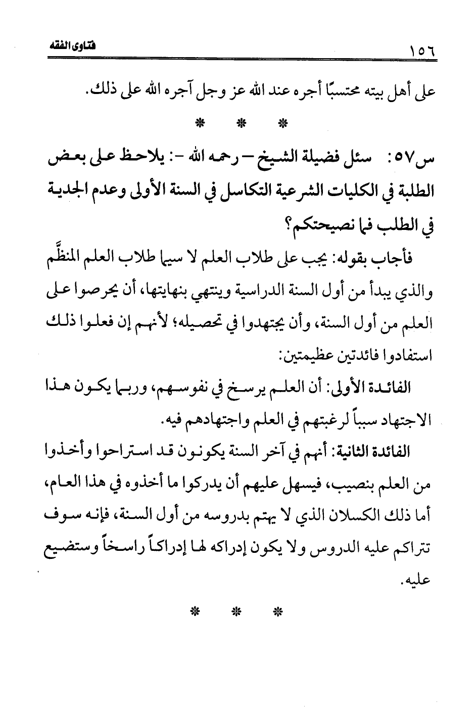 س 57: سئل فضيلة الشيخ- رحمه الله-: يلاحظ على بعض الطلبة في الكليات الشرعية التكاسل في السنة الأولى وعدم الجدية في الطلب فما نصيحتكم؟