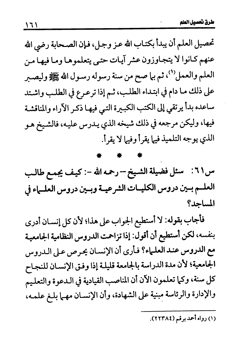 س 61: سئل فضيلة الشيخ- رحمه الله-: كيف يجمع طالب العلم بين دروس الكليات الشرعية وبين دروس العلماء في المساجد؟