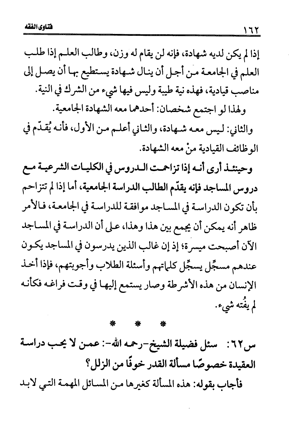 س 62: سئل فضيلة الشيخ- رحمه الله-: عمن لا يحب دراسة العقيدة خصوصًا مسألة القدر خوفًا من الزلل؟