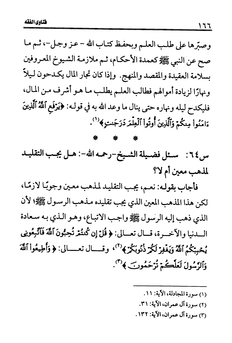 فأجاب بقوله: نعم، يجب التقليد لمذهب معين وجوبًا لازمًا، لكن هذا المذهب المعين الذي يجب تقليده مذهب الرسول - صلى الله عليه وسلم -؛ لأن الذي ذهب إليه الرسول - صلى الله عليه وسلم - واجب الاتباع، وهو الذي به سعادة الدنيا والآخرة، قال تعالى: (قُلْ إِنْ كُنْتُمْ تُحِبُّونَ اللَّهَ فَاتَّبِعُونِي يُحْبِبْكُمُ اللَّهُ وَيَغْفِرْ لَكُمْ ذُنُوبَكُمْ) (2) ، وقال تعالى (وَأَطِيعُوا اللَّهَ وَالرَّسُولَ لَعَلَّكُمْ تُرْحَمُونَ) (3) .