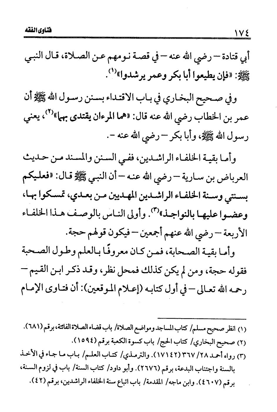 وفي صحيح البخاري في باب الاقتداء بسنن رسول الله - صلى الله عليه وسلم - أن عمر بن الخطاب رضي الله عنه قال: "هما المرءان يقتدى بهما" (2) ، يعني رسول الله - صلى الله عليه وسلم -، وأبا بكر- رضي الله عنه-.