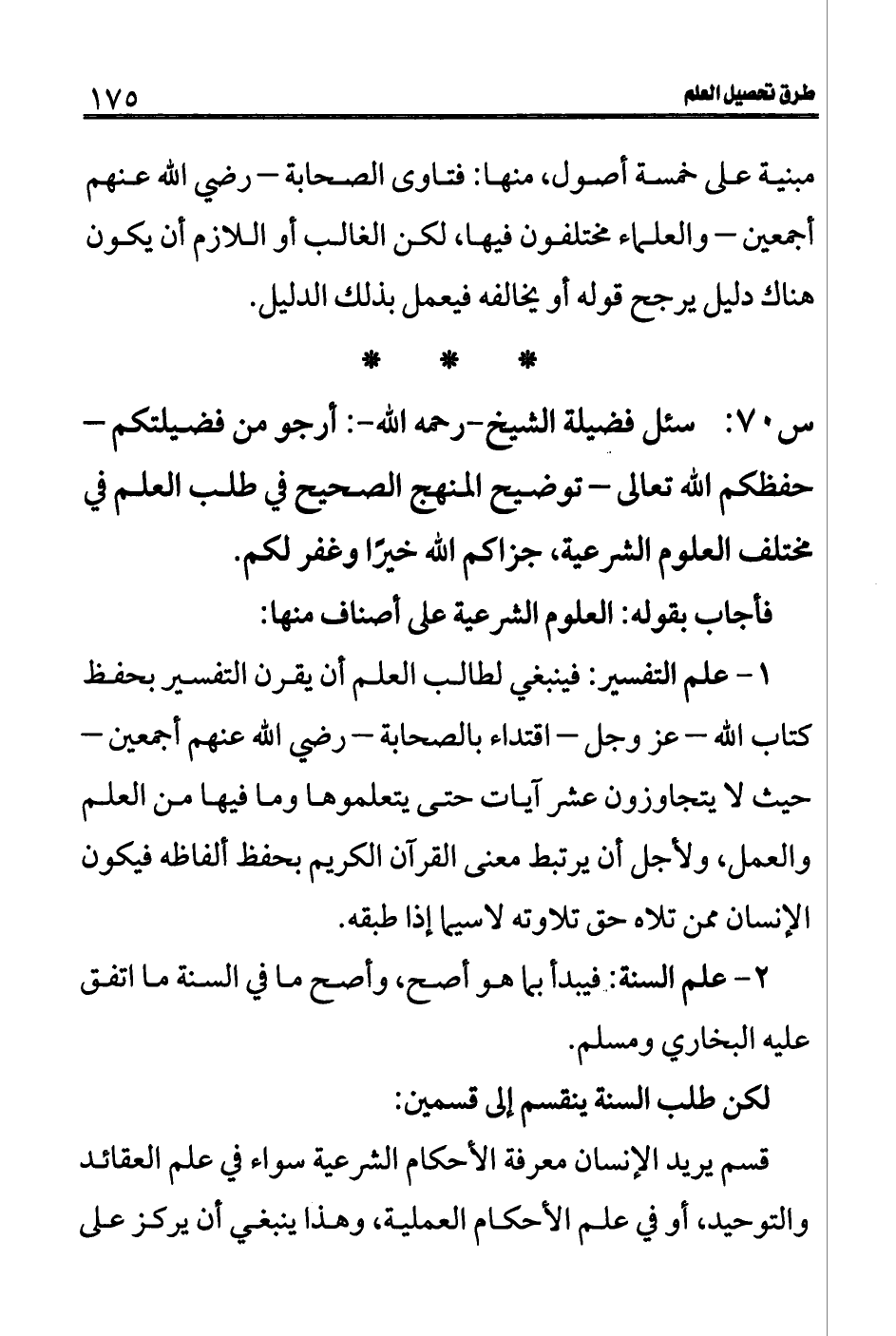 س 70: سئل فضيلة الشيخ- رحمه الله-: أرجو من فضيلتكم- حفظكم الله تعالى- توضيح المنهج الصحيح في طلب العلم في مختلف العلوم الشرعية، جزاكم الله خيرًا وكفر لكم.