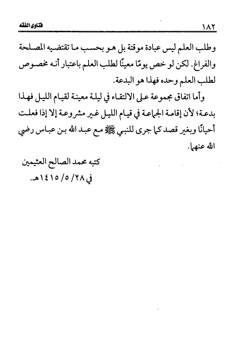 وطلب العلم ليس عبادة مؤقتة بل هو بحسب ما تقتضيه المصلحة والفراغ. لكن لو خص يومًا معينًا لطلب العلم باعتبار أنه مخصوص لطلب العلم وحده فهذا هو البدعة.