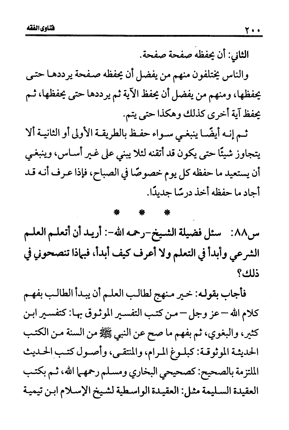 س 88: سئل فضيلة الشيخ- رحمه الله-: أريد أن أتعلم العلم الشرعى وأبدأ في التعلم ولا أعرف كيف أبدأ، فبماذا تنصحوني في ذلك؟