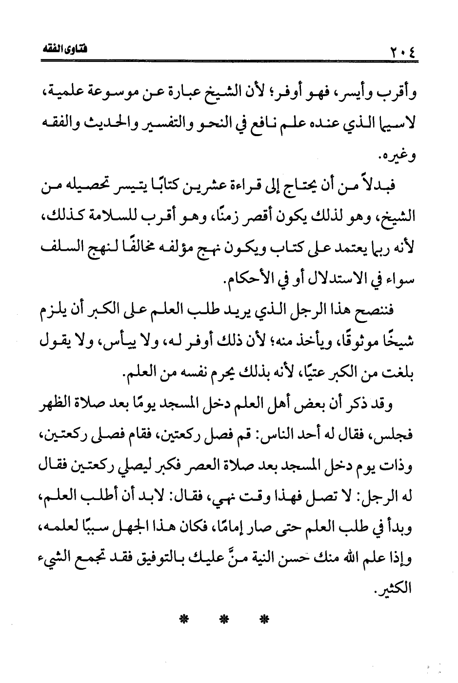 فبدلاً من أن يحتاج إلى قراءة عشرين كتابًا يتيسر تحصيله من الشيخ، وهو لذلك يكون أقصر زمنًا، وهو أقرب للسلامة كذلك، لأنه ربما يعتمد على كتاب ويكون نهج مؤلفه مخالفًا لنهج السلف