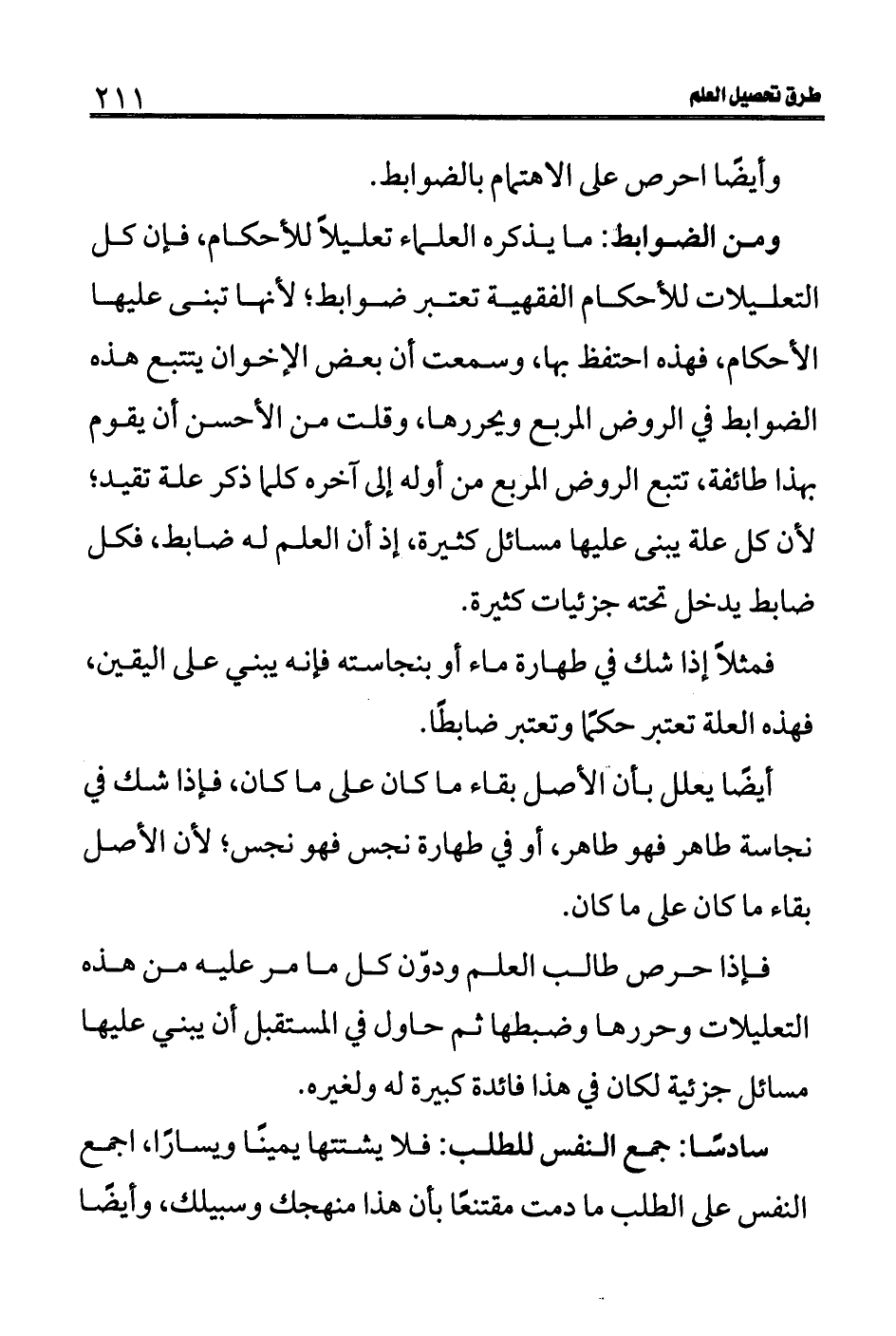 فإذا حرص طالب العلم ودوّن كل ما مر عليه من هذه التعليلات وحررها وضبطها ثم حاول في المستقبل أن يبني عليها مسائل جزئية لكان في هذا فائدة كبيرة له ولغيره.