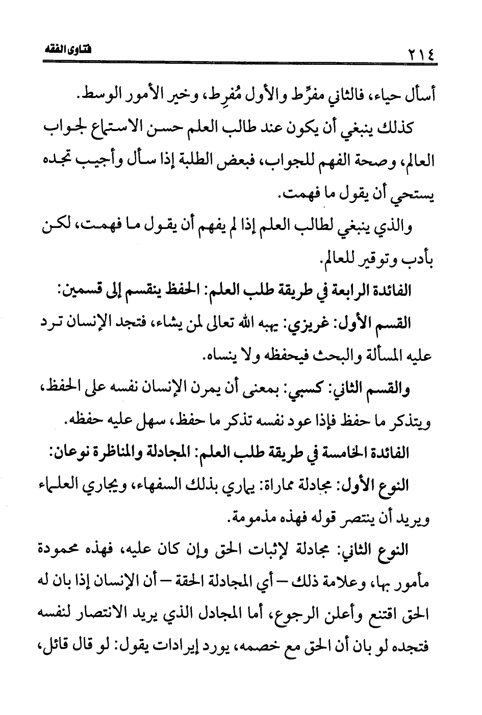 الفائدة الخامسة في طريقة طلب العلم: المجادلة والمناظرة نوعان: