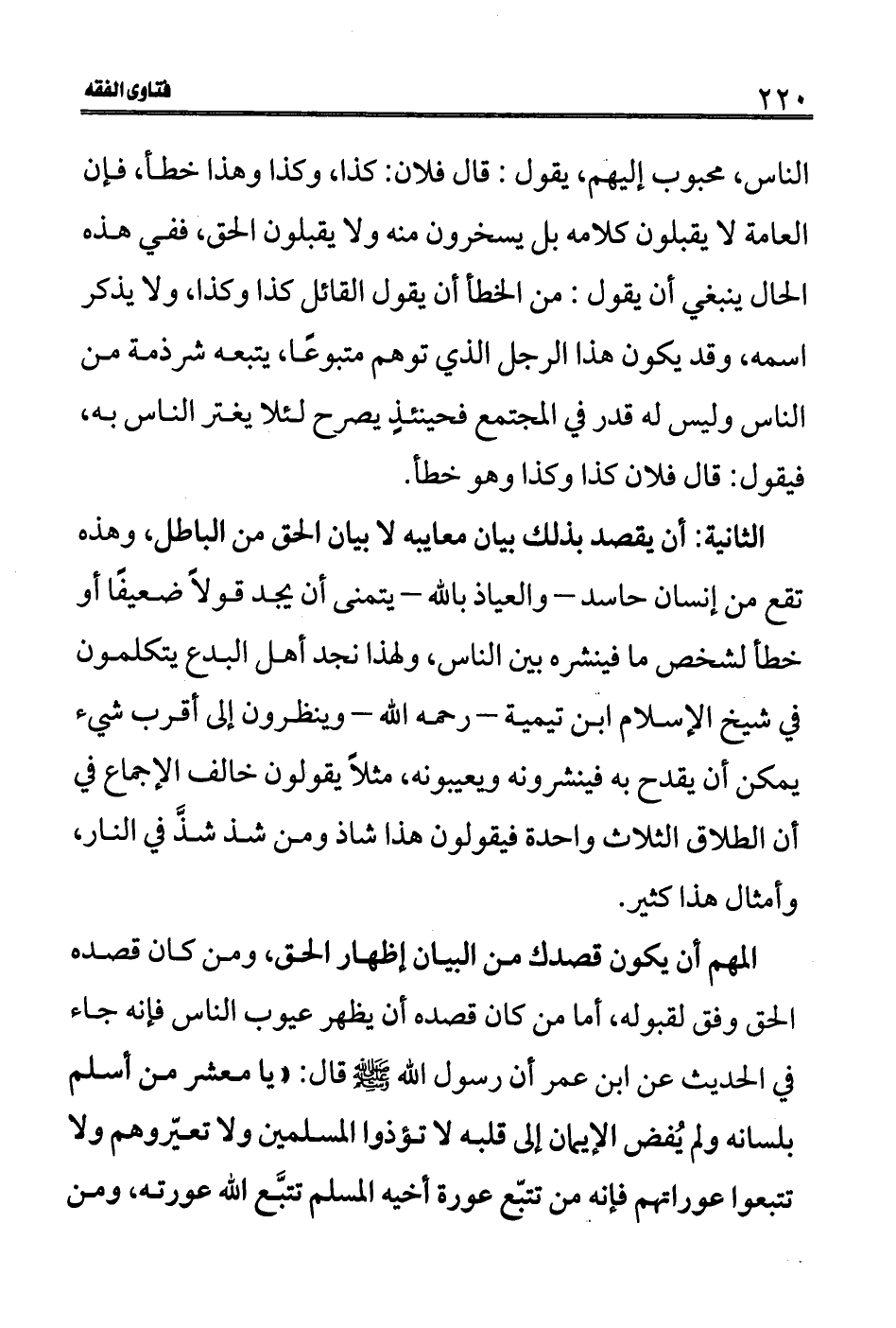 المهم أن يكون قصدك من البيان إظهار الحق، ومن كان قصده الحق وفق لقبوله، أما من كان قصده أن يظهر عيوب الناس فإنه جاء في الحديث عن ابن عمر أن رسول الله - صلى الله عليه وسلم - قال: ايا معشر من أسلم بلسانه ولم يُفض الإيمان إلى قلبه لا تؤذوا المسلمين ولا تعيّروهم ولا تتبعوا عوراتهم فإنه من تتبّع عورة أخيه المسلم تتبَّع الله عورته، ومن