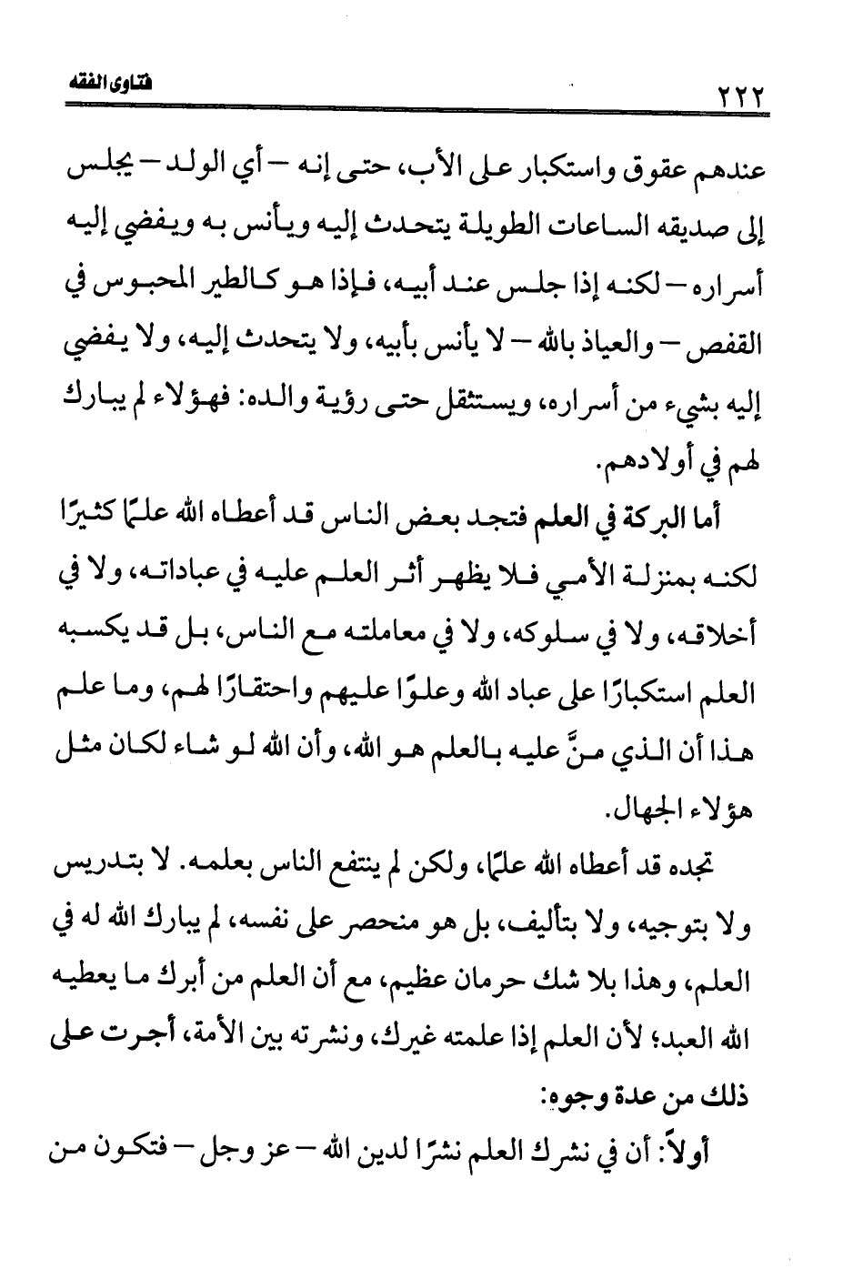 عندهم عقوق واستكبار على الأب، حتى إنه- أي الولد- يجلس إلى صديقه الساعات الطويلة يتحدث إليه ويأنس به ويفضي إليه أسراره- لكنه إذا جلس عند أبيه، فإذا هو كالطير المحبوس في