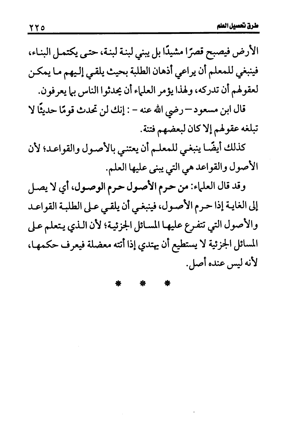 كذلك أيضًا ينبغي للمعلم أن يعتني بالأصول والقواعد؛ لأن الأصول والقواعد هي التي يبنى عليها العلم.