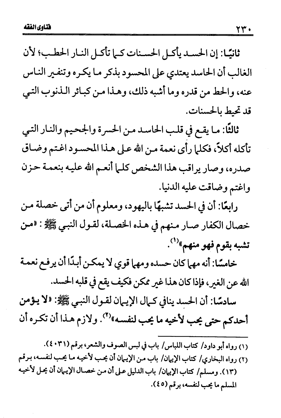 (2) رواه البخاري/كتاب الإيمان/باب من الإيمان أن يحب لأخيه ما يحب لنفسه، برقم (13) . ومسلم/كتاب الإيمان/باب الدليل على أن من خصال الإيمان أن يحل لأخيه المسلم ما يحب لنفسه، برقم (45) .
