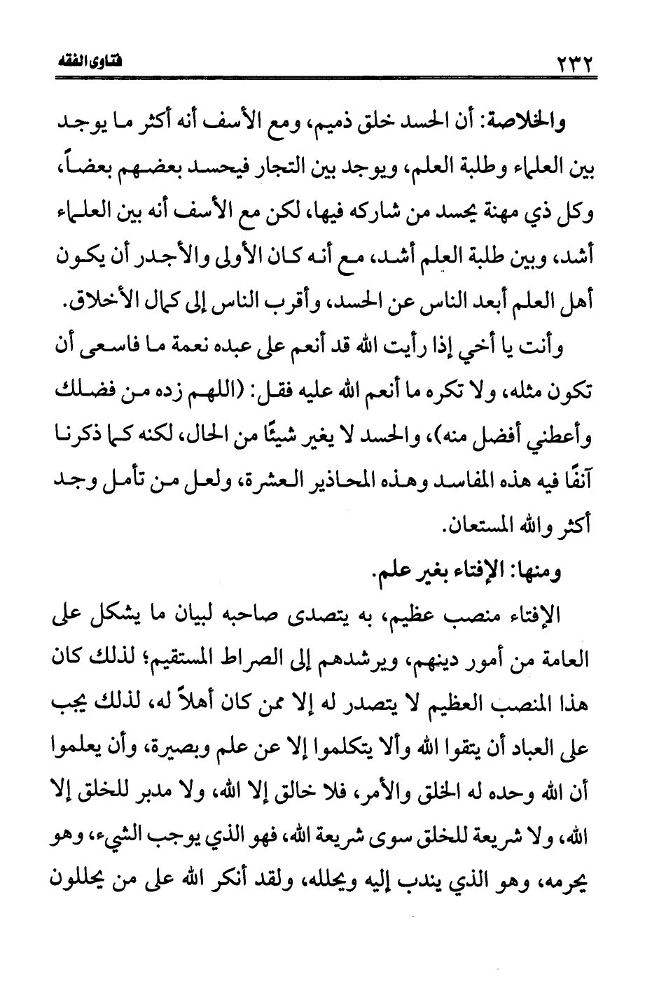 والخلاصة: أن الحسد خلق ذميم، ومع الأسف أنه أكثر ما يوجد بين العلماء وطلبة العلم، ويوجد بين التجار فيحسد بعضهم بعضاً، وكل ذي مهنة يحسد من شاركه فيها، لكن مع الأسف أنه بين العلماء أشد، وبين طلبة العلم أشد، مع أنه كان الأولى والأجدر أن يكون أهل العلم أبعد الناس عن الحسد، وأقرب الناس إلى كمال الأخلاق.