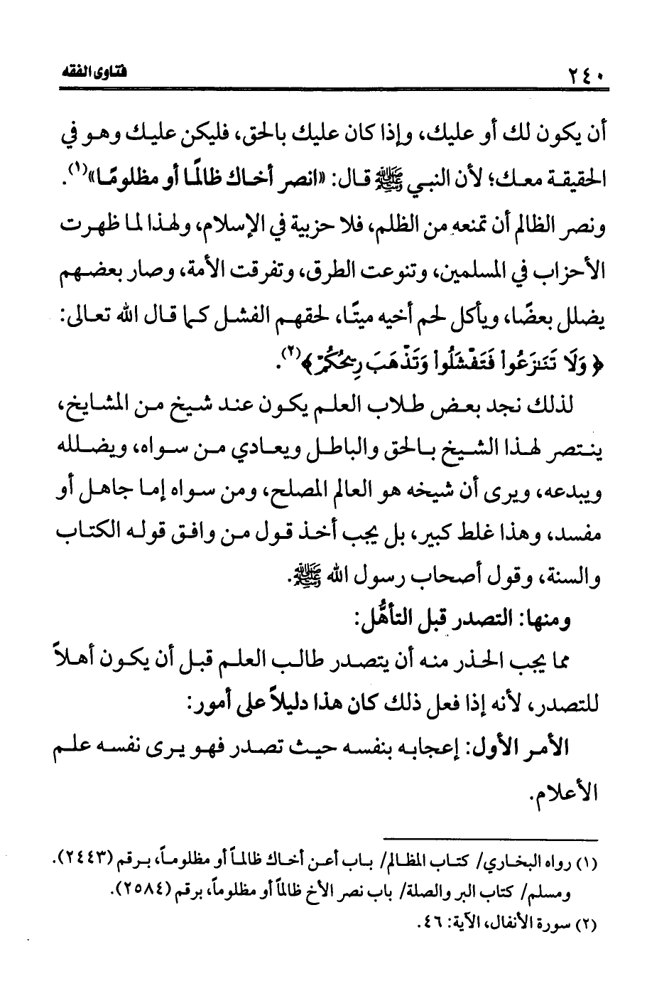 ونصر الظالم أن تمنعه من الظلم، فلا حزبية في الإسلام، ولهذا لما ظهرت الأحزاب في المسلمين، وتنوعت الطرق، وتفرقت الأمة، وصار بعضهم يضلل بعضًا، ويكل لحم أخيه ميتًا، لحقهم الفشل كما قال الله تعالى: (وَلَا تَنَازَعُوا فَتَفْشَلُوا وَتَذْهَبَ رِيحُكُمْ) (2) .