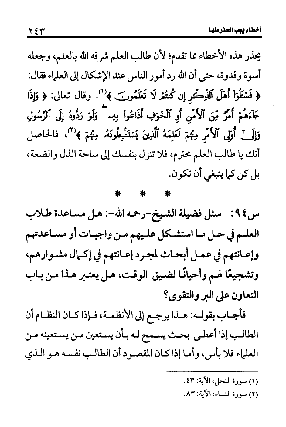 س 94: سئل فضيلة الشيخ- رحمه الله-: هل مساعدة طلاب العلم في حل ما استشكل عليهم من واجبات أو مساعدتهم وإعانتهم في عمل أبحاث لمجرد إعانتهم في إكمال مشوارهم،