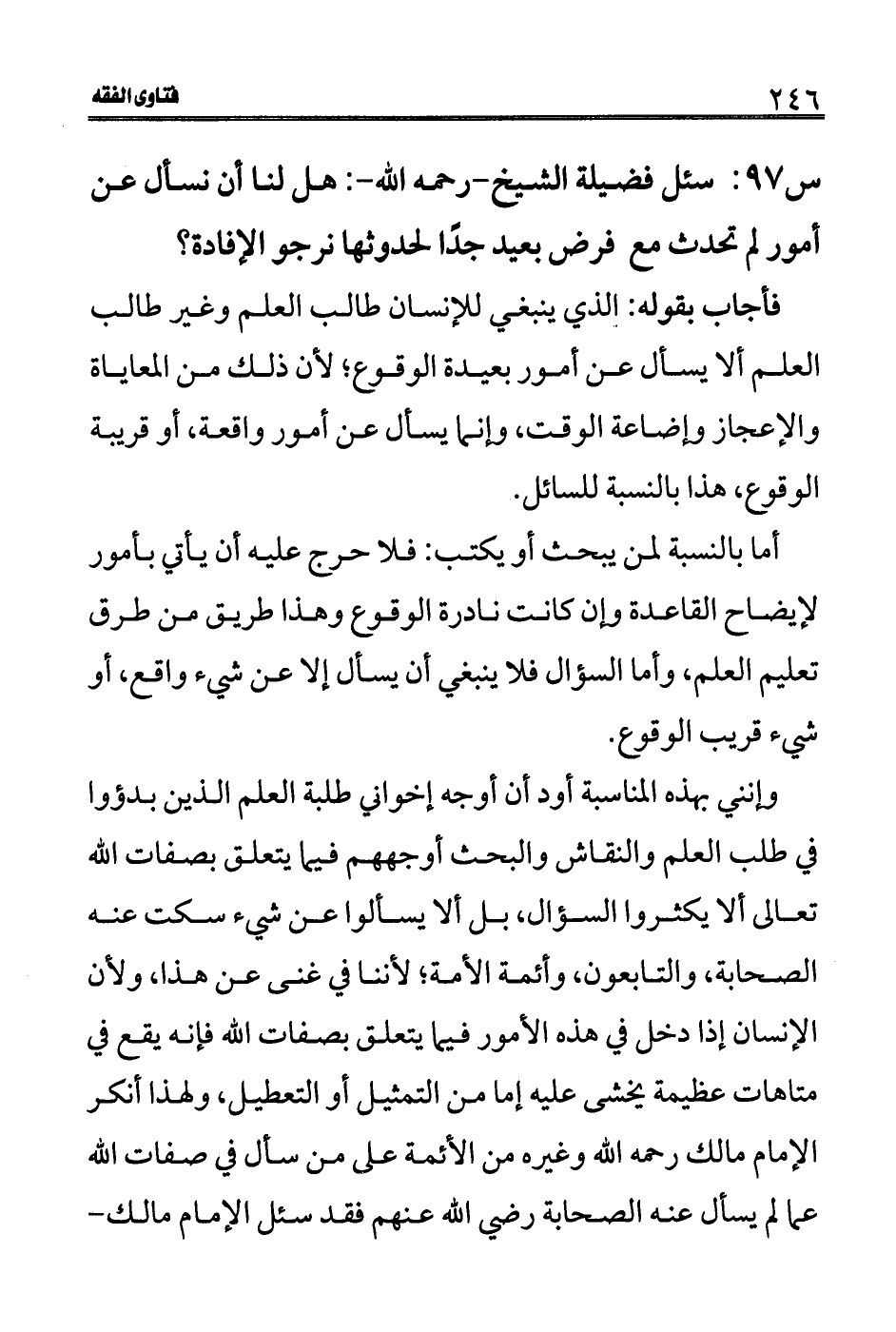 س 97: سئل فضيلة الشيخ- رحمه الله-: هل لنا أن نسأل عن أمور لم تحدث مع فرض بعيد جدًا لحدوثها نرجو الإفادة؟