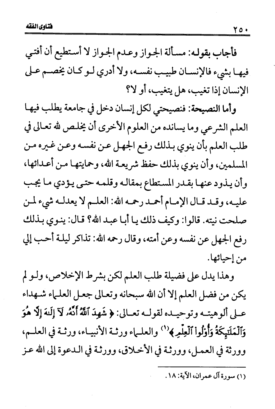 وأما النصيحة: فنصيحتي لكل إنسان دخل في جامعة يطلب فيها العلم الشرعي وما يسانده من العلوم الأخرى أن يخلص لله تعالى في طلب العلم بأن ينوي بذلك رفع الجهل عن نفسه وعن غيره من المسلمين، وأن ينوي بذلك حفظ شريعة الله، وحمايتها من أعدائها، وأن يذود عنها بقدر المستطاع بمقاله وقلمه حتى يؤدي ما يجب عليه، وقد قال الإمام أحمد رحمه الله: العلم لا يعدله شيء لمن صلحت نيته. قالوا: وكيف ذلك يا أبا عبد الله؟ قال: ينوي بذلك رفع الجهل عن نفسه وعن أمته، وقال رحمه الله: تذاكر ليلة أحب إلي من إحيائها.